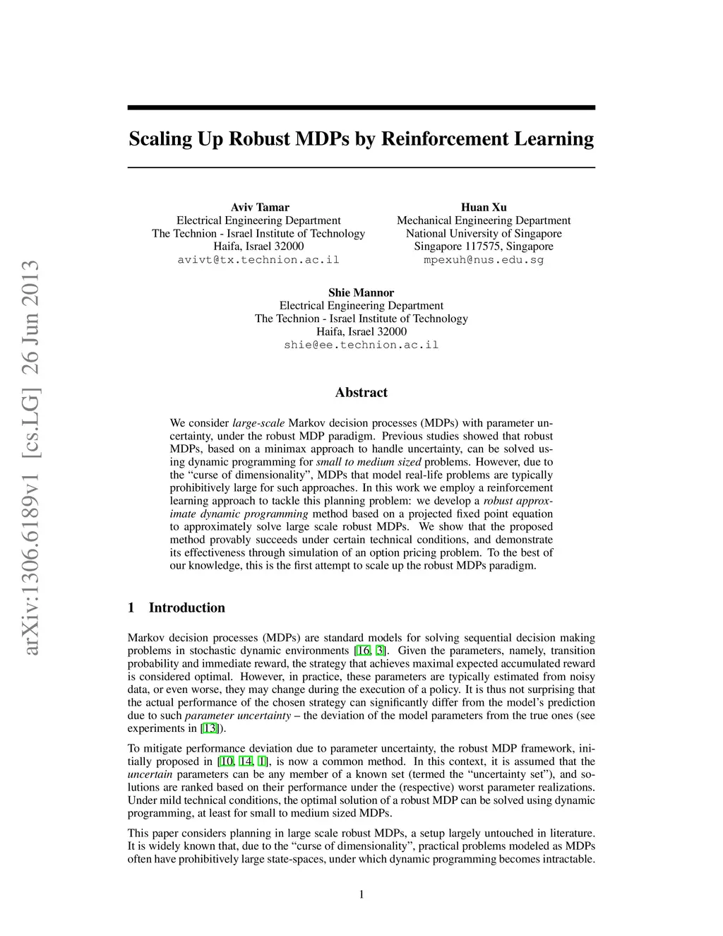 We consider large-scale Markov decision processes (MDPs) with parameter uncertainty, under the robust MDP paradigm. Previous studies showed that robust MDPs, based on a minimax approach to handle uncertainty, can be solved using dynamic programming for small to medium sized problems. However, due to the "curse of dimensionality", MDPs that model real-life problems are typically prohibitively large for such approaches. In this work we employ a reinforcement learning approach to tackle this planning problem: we develop a robust approximate dynamic programming method based on a projected fixed point equation to approximately solve large scale robust MDPs. We show that the proposed method provably succeeds under certain technical conditions, and demonstrate its effectiveness through simulation of an option pricing problem. To the best of our knowledge, this is the first attempt to scale up the robust MDPs paradigm.