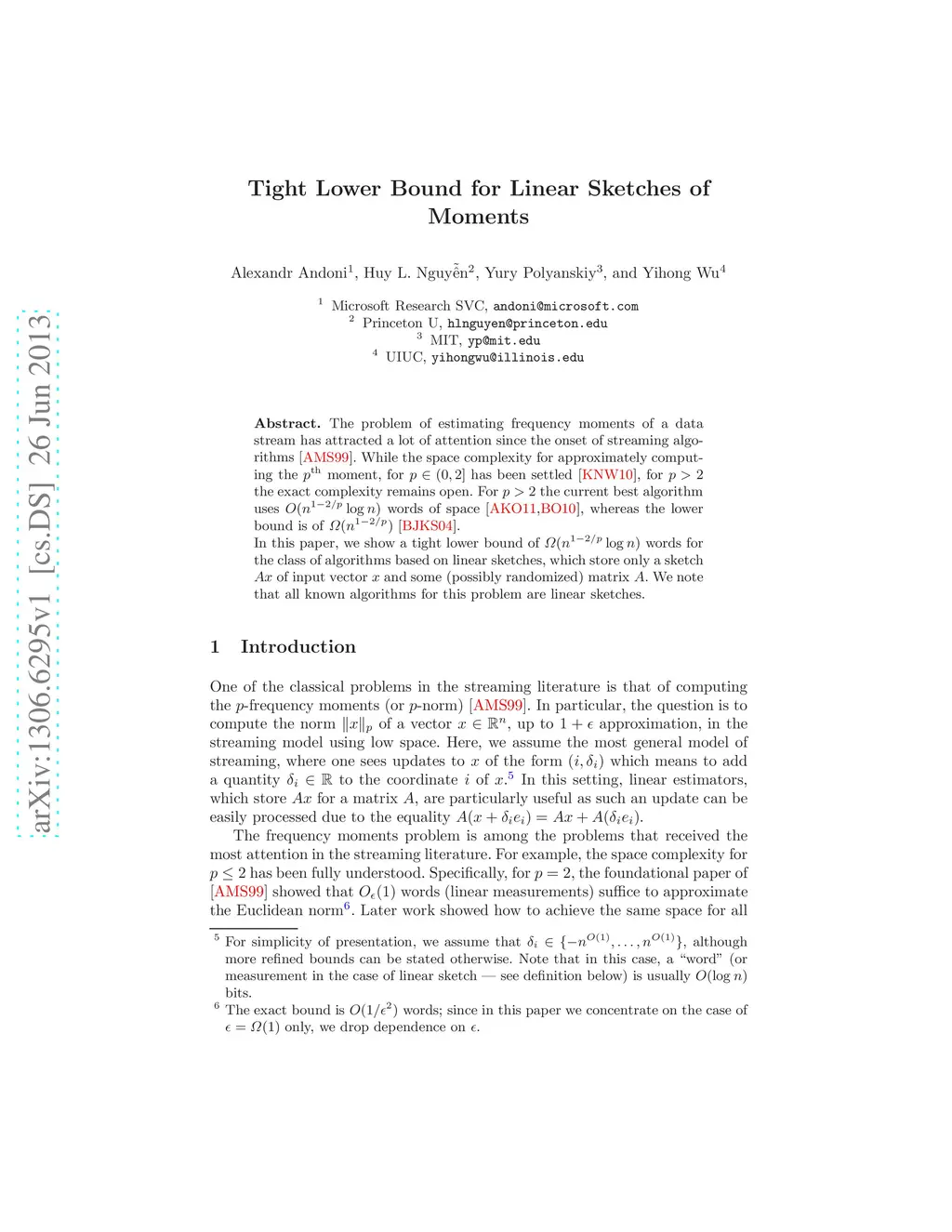 The problem of estimating frequency moments of a data stream has attracted a lot of attention since the onset of streaming algorithms [AMS99]. While the space complexity for approximately computing the moment, for has been settled [KNW10], for the exact complexity remains open. For the current best algorithm uses words of space [AKO11,BO10], whereas the lower bound is of [BJKS04]. In this paper, we show a tight lower bound of words for the class of algorithms based on linear sketches, which store only a sketch of input vector and some (possibly randomized) matrix . We note that all known algorithms for this problem are linear sketches.