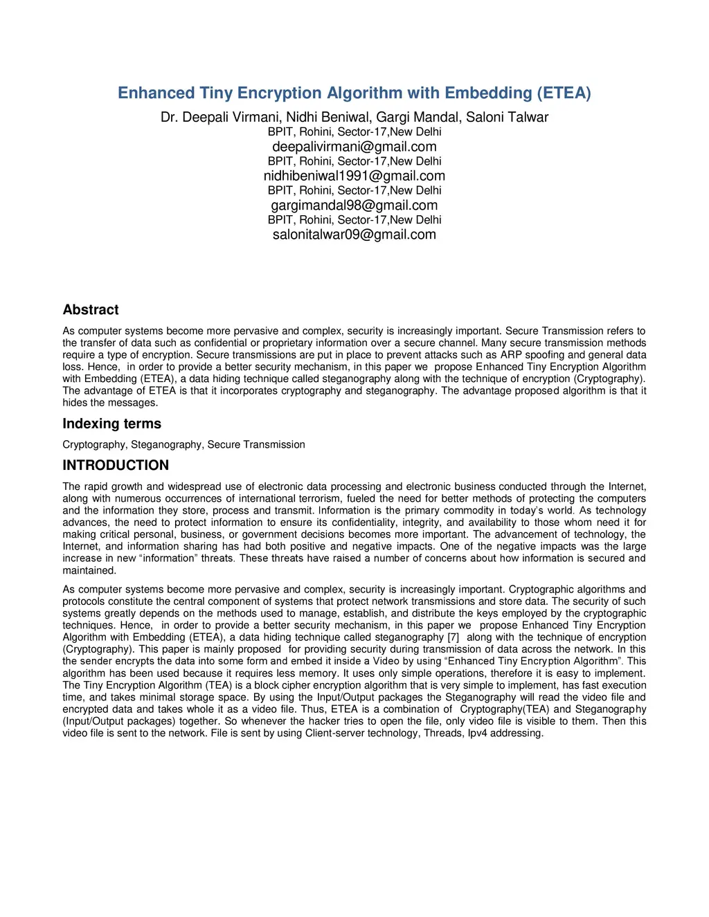 As computer systems become more pervasive and complex, security is increasingly important. Secure Transmission refers to the transfer of data such as confidential or proprietary information over a secure channel. Many secure transmission methods require a type of encryption. Secure transmissions are put in place to prevent attacks such as ARP spoofing and general data loss. Hence, in order to provide a better security mechanism, in this paper we propose Enhanced Tiny Encryption Algorithm with Embedding (ETEA), a data hiding technique called steganography along with the technique of encryption (Cryptography). The advantage of ETEA is that it incorporates cryptography and steganography. The advantage proposed algorithm is that it hides the messages.