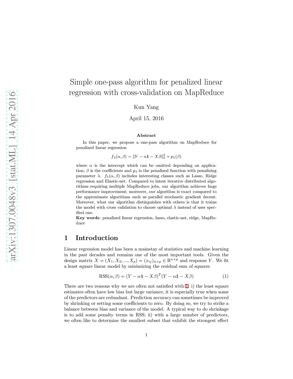 In this paper, we propose a one-pass algorithm on MapReduce for penalized linear regression \[f_\lambda(\alpha, \beta) = \|Y - \alpha\mathbf{1} - X\beta\|_2^2 + p_{\lambda}(\beta)\] where is the intercept which can be omitted depending on application; is the coefficients and is the penalized function with penalizing parameter . includes interesting classes such as Lasso, Ridge regression and Elastic-net. Compared to latest iterative distributed algorithms requiring multiple MapReduce jobs, our algorithm achieves huge performance improvement; moreover, our algorithm is exact compared to the approximate algorithms such as parallel stochastic gradient decent. Moreover, what our algorithm distinguishes with others is that it trains the model with cross validation to choose optimal instead of user specified one. Key words: penalized linear regression, lasso, elastic-net, ridge, MapReduce