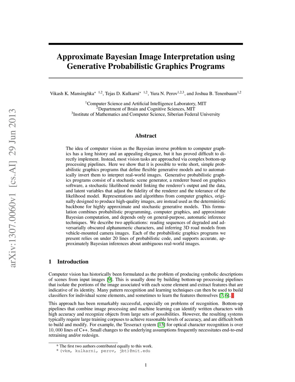 The idea of computer vision as the Bayesian inverse problem to computer graphics has a long history and an appealing elegance, but it has proved difficult to directly implement. Instead, most vision tasks are approached via complex bottom-up processing pipelines. Here we show that it is possible to write short, simple probabilistic graphics programs that define flexible generative models and to automatically invert them to interpret real-world images. Generative probabilistic graphics programs consist of a stochastic scene generator, a renderer based on graphics software, a stochastic likelihood model linking the renderer's output and the data, and latent variables that adjust the fidelity of the renderer and the tolerance of the likelihood model. Representations and algorithms from computer graphics, originally designed to produce high-quality images, are instead used as the deterministic backbone for highly approximate and stochastic generative models. This formulation combines probabilistic programming, computer graphics, and approximate Bayesian computation, and depends only on general-purpose, automatic inference techniques. We describe two applications: reading sequences of degraded and adversarially obscured alphanumeric characters, and inferring 3D road models from vehicle-mounted camera images. Each of the probabilistic graphics programs we present relies on under 20 lines of probabilistic code, and supports accurate, approximately Bayesian inferences about ambiguous real-world images.