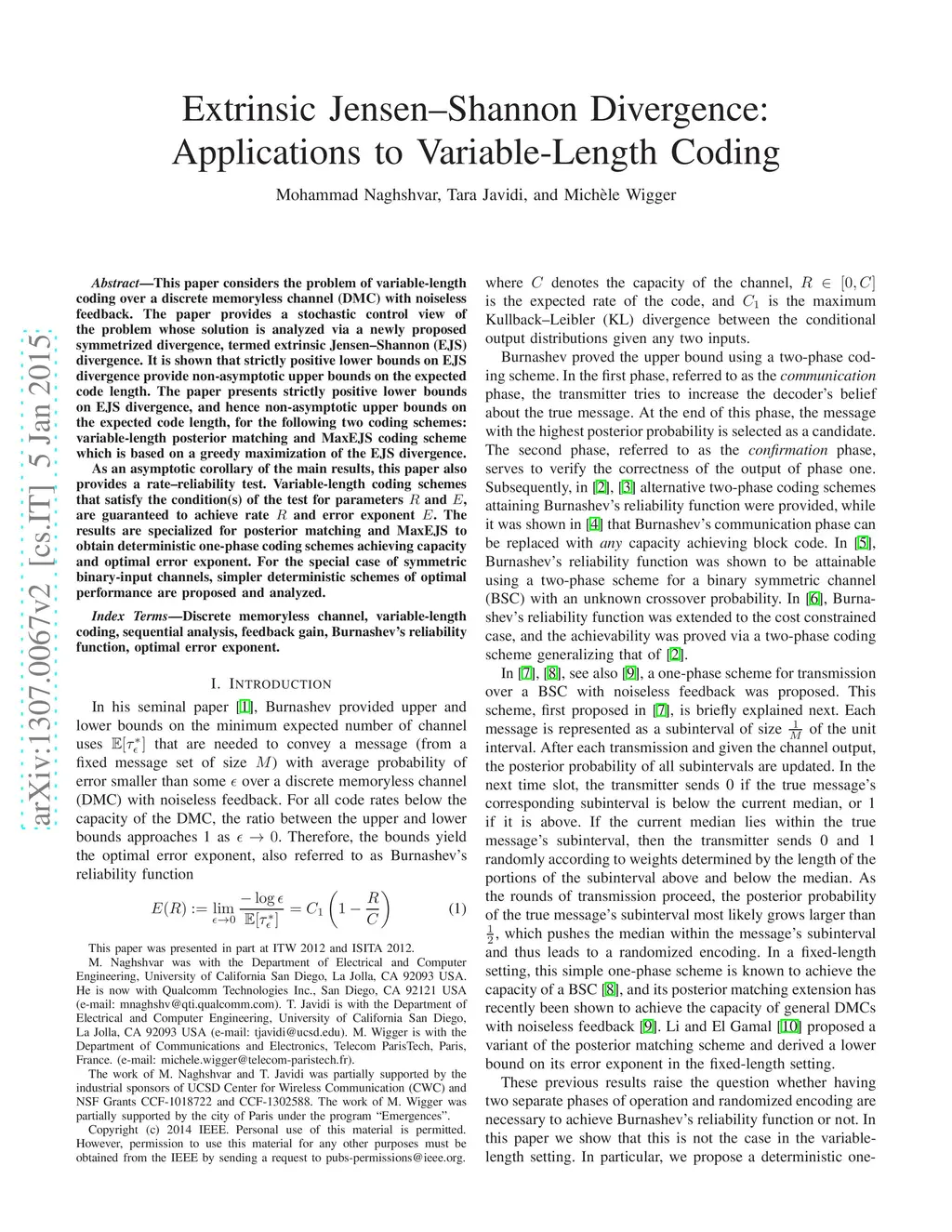 This paper considers the problem of variable-length coding over a discrete memoryless channel (DMC) with noiseless feedback. The paper provides a stochastic control view of the problem whose solution is analyzed via a newly proposed symmetrized divergence, termed extrinsic Jensen-Shannon (EJS) divergence. It is shown that strictly positive lower bounds on EJS divergence provide non-asymptotic upper bounds on the expected code length. The paper presents strictly positive lower bounds on EJS divergence, and hence non-asymptotic upper bounds on the expected code length, for the following two coding schemes: variable-length posterior matching and MaxEJS coding scheme which is based on a greedy maximization of the EJS divergence. As an asymptotic corollary of the main results, this paper also provides a rate-reliability test. Variable-length coding schemes that satisfy the condition(s) of the test for parameters and , are guaranteed to achieve rate and error exponent . The results are specialized for posterior matching and MaxEJS to obtain deterministic one-phase coding schemes achieving capacity and optimal error exponent. For the special case of symmetric binary-input channels, simpler deterministic schemes of optimal performance are proposed and analyzed.