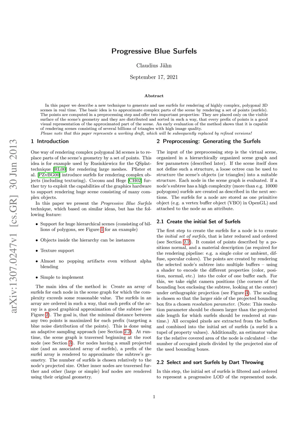 In this paper we describe a new technique to generate and use surfels for rendering of highly complex, polygonal 3D scenes in real time. The basic idea is to approximate complex parts of the scene by rendering a set of points (surfels). The points are computed in a preprocessing step and offer two important properties: They are placed only on the visible surface of the scene's geometry and they are distributed and sorted in such a way, that every prefix of points is a good visual representation of the approximated part of the scene. An early evaluation of the method shows that it is capable of rendering scenes consisting of several billions of triangles with high image quality.