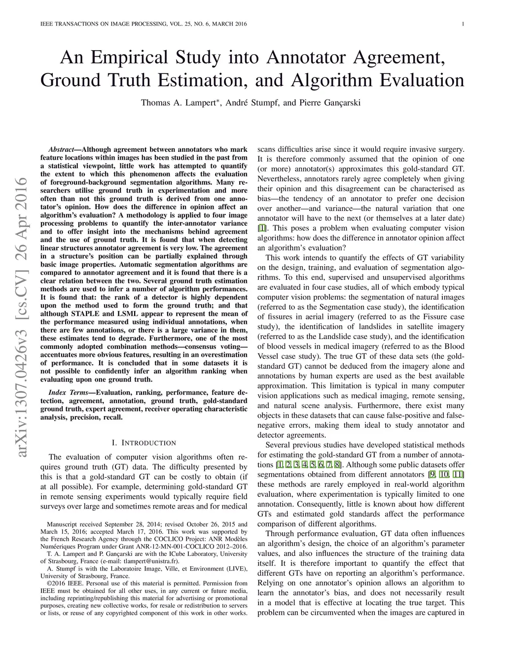 Although agreement between annotators has been studied in the past from a statistical viewpoint, little work has attempted to quantify the extent to which this phenomenon affects the evaluation of computer vision (CV) object detection algorithms. Many researchers utilise ground truth (GT) in experiments and more often than not this GT is derived from one annotator's opinion. How does the difference in opinion affect an algorithm's evaluation? Four examples of typical CV problems are chosen, and a methodology is applied to each to quantify the inter-annotator variance and to offer insight into the mechanisms behind agreement and the use of GT. It is found that when detecting linear objects annotator agreement is very low. The agreement in object position, linear or otherwise, can be partially explained through basic image properties. Automatic object detectors are compared to annotator agreement and it is found that a clear relationship exists. Several methods for calculating GTs from a number of annotations are applied and the resulting differences in the performance of the object detectors are quantified. It is found that the rank of a detector is highly dependent upon the method used to form the GT. It is also found that although the STAPLE and LSML GT estimation methods appear to represent the mean of the performance measured using the individual annotations, when there are few annotations, or there is a large variance in them, these estimates tend to degrade. Furthermore, one of the most commonly adopted annotation combination methods--consensus voting--accentuates more obvious features, which results in an overestimation of the algorithm's performance. Finally, it is concluded that in some datasets it may not be possible to state with any confidence that one algorithm outperforms another when evaluating upon one GT and a method for calculating confidence bounds is discussed.