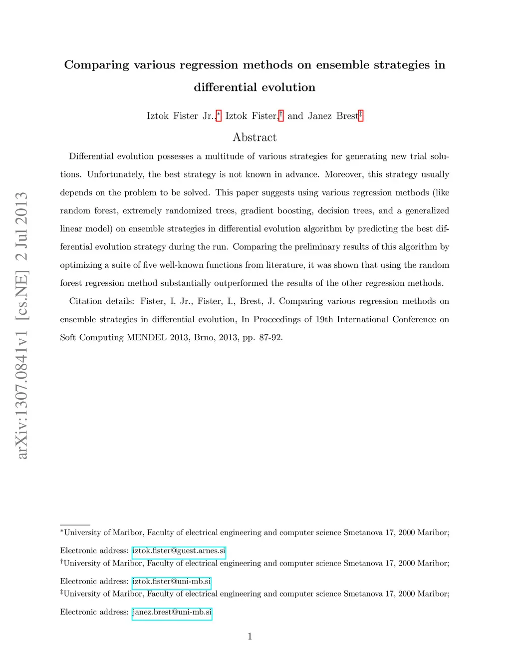 Differential evolution possesses a multitude of various strategies for generating new trial solutions. Unfortunately, the best strategy is not known in advance. Moreover, this strategy usually depends on the problem to be solved. This paper suggests using various regression methods (like random forest, extremely randomized trees, gradient boosting, decision trees, and a generalized linear model) on ensemble strategies in differential evolution algorithm by predicting the best differential evolution strategy during the run. Comparing the preliminary results of this algorithm by optimizing a suite of five well-known functions from literature, it was shown that using the random forest regression method substantially outperformed the results of the other regression methods.