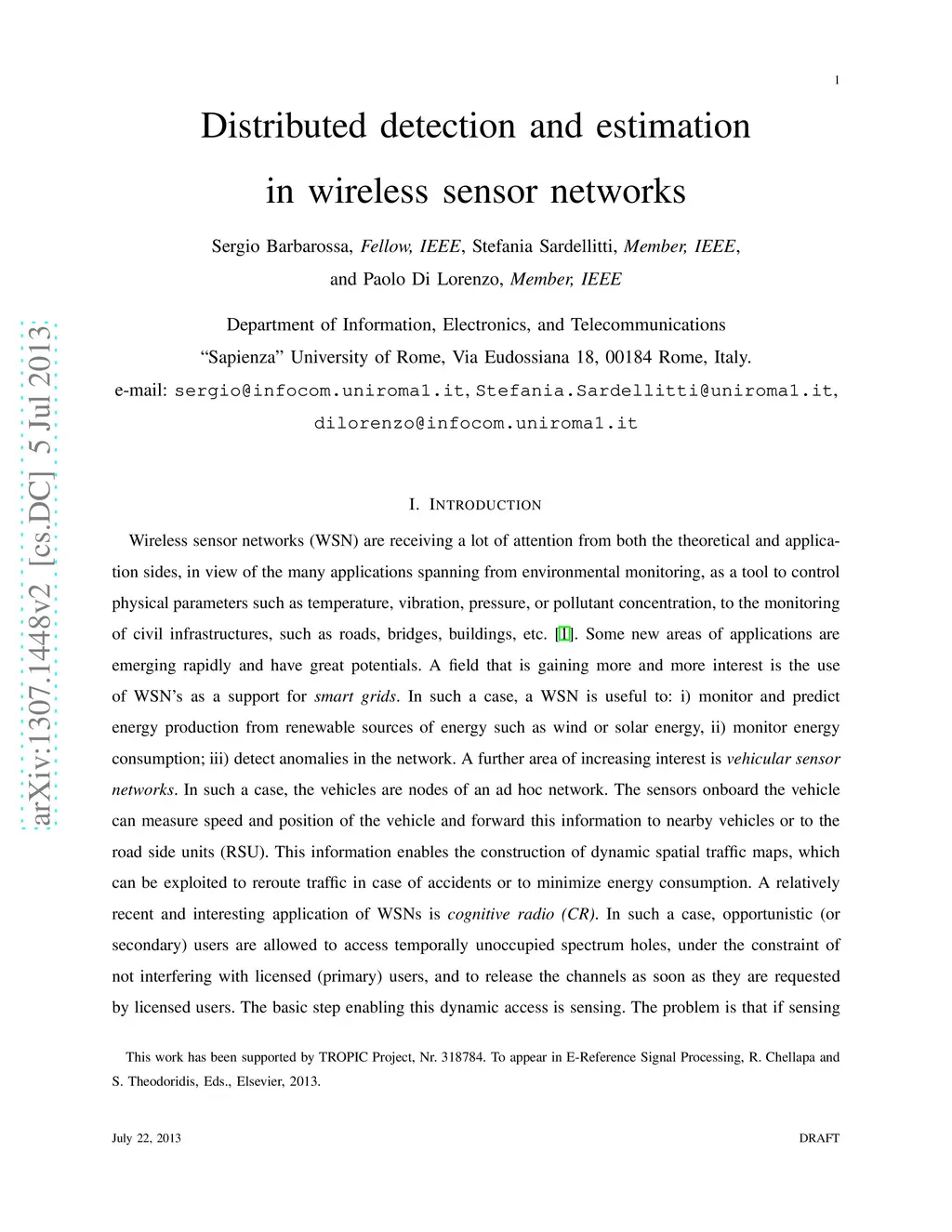 In this article we consider the problems of distributed detection and estimation in wireless sensor networks. In the first part, we provide a general framework aimed to show how an efficient design of a sensor network requires a joint organization of in-network processing and communication. Then, we recall the basic features of consensus algorithm, which is a basic tool to reach globally optimal decisions through a distributed approach. The main part of the paper starts addressing the distributed estimation problem. We show first an entirely decentralized approach, where observations and estimations are performed without the intervention of a fusion center. Then, we consider the case where the estimation is performed at a fusion center, showing how to allocate quantization bits and transmit powers in the links between the nodes and the fusion center, in order to accommodate the requirement on the maximum estimation variance, under a constraint on the global transmit power. We extend the approach to the detection problem. Also in this case, we consider the distributed approach, where every node can achieve a globally optimal decision, and the case where the decision is taken at a central node. In the latter case, we show how to allocate coding bits and transmit power in order to maximize the detection probability, under constraints on the false alarm rate and the global transmit power. Then, we generalize consensus algorithms illustrating a distributed procedure that converges to the projection of the observation vector onto a signal subspace. We then address the issue of energy consumption in sensor networks, thus showing how to optimize the network topology in order to minimize the energy necessary to achieve a global consensus. Finally, we address the problem of matching the topology of the network to the graph describing the statistical dependencies among the observed variables.
