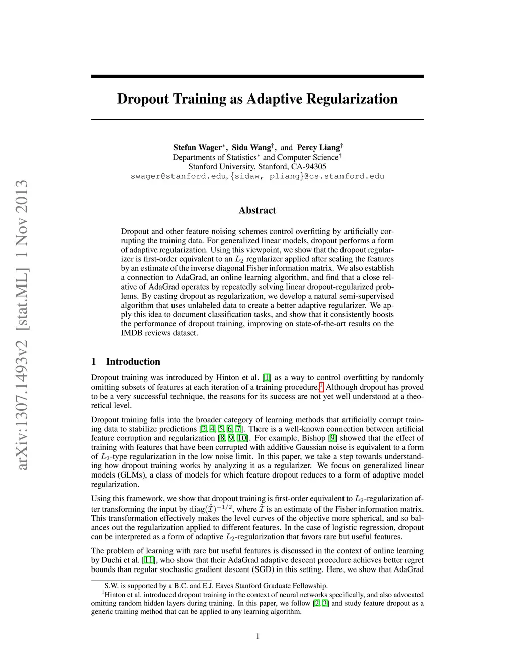 Dropout and other feature noising schemes control overfitting by artificially corrupting the training data. For generalized linear models, dropout performs a form of adaptive regularization. Using this viewpoint, we show that the dropout regularizer is first-order equivalent to an L2 regularizer applied after scaling the features by an estimate of the inverse diagonal Fisher information matrix. We also establish a connection to AdaGrad, an online learning algorithm, and find that a close relative of AdaGrad operates by repeatedly solving linear dropout-regularized problems. By casting dropout as regularization, we develop a natural semi-supervised algorithm that uses unlabeled data to create a better adaptive regularizer. We apply this idea to document classification tasks, and show that it consistently boosts the performance of dropout training, improving on state-of-the-art results on the IMDB reviews dataset.