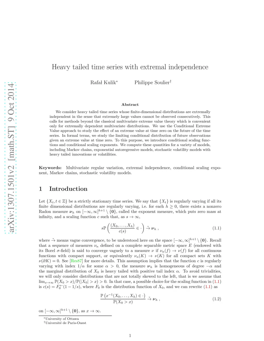 We consider strictly stationary heavy tailed time series whose finite-dimensional exponent measures are concentrated on axes, and hence their extremal properties cannot be tackled using classical multivariate regular variation that is suitable for time series with extremal dependence. We recover relevant information about limiting behavior of time series with extremal independence by introducing a sequence of scaling functions and conditional scaling exponent. Both quantities provide more information about joint extremes than a widely used tail dependence coefficient. We calculate the scaling functions and the scaling exponent for variety of models, including Markov chains, exponential autoregressive model, stochastic volatility with heavy tailed innovations or volatility.