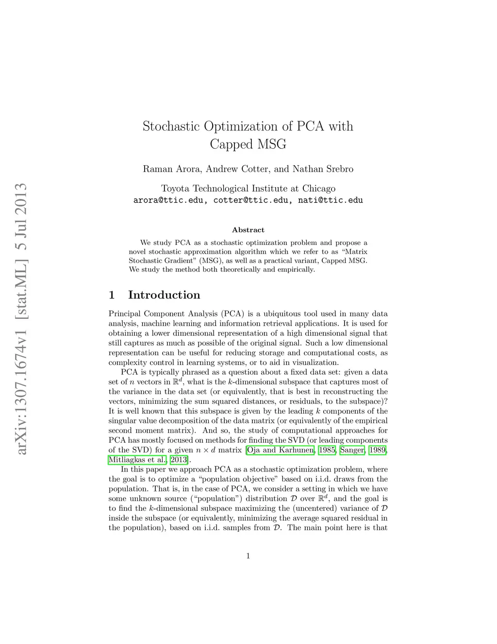 We study PCA as a stochastic optimization problem and propose a novel stochastic approximation algorithm which we refer to as "Matrix Stochastic Gradient" (MSG), as well as a practical variant, Capped MSG. We study the method both theoretically and empirically.