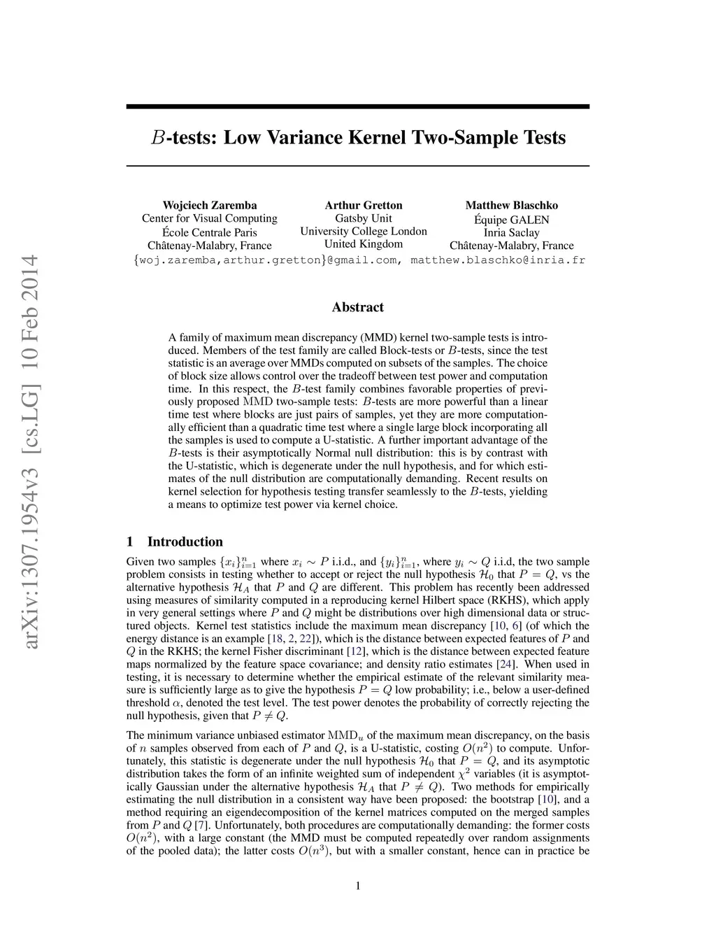 A family of maximum mean discrepancy (MMD) kernel two-sample tests is introduced. Members of the test family are called Block-tests or B-tests, since the test statistic is an average over MMDs computed on subsets of the samples. The choice of block size allows control over the tradeoff between test power and computation time. In this respect, the -test family combines favorable properties of previously proposed MMD two-sample tests: B-tests are more powerful than a linear time test where blocks are just pairs of samples, yet they are more computationally efficient than a quadratic time test where a single large block incorporating all the samples is used to compute a U-statistic. A further important advantage of the B-tests is their asymptotically Normal null distribution: this is by contrast with the U-statistic, which is degenerate under the null hypothesis, and for which estimates of the null distribution are computationally demanding. Recent results on kernel selection for hypothesis testing transfer seamlessly to the B-tests, yielding a means to optimize test power via kernel choice.