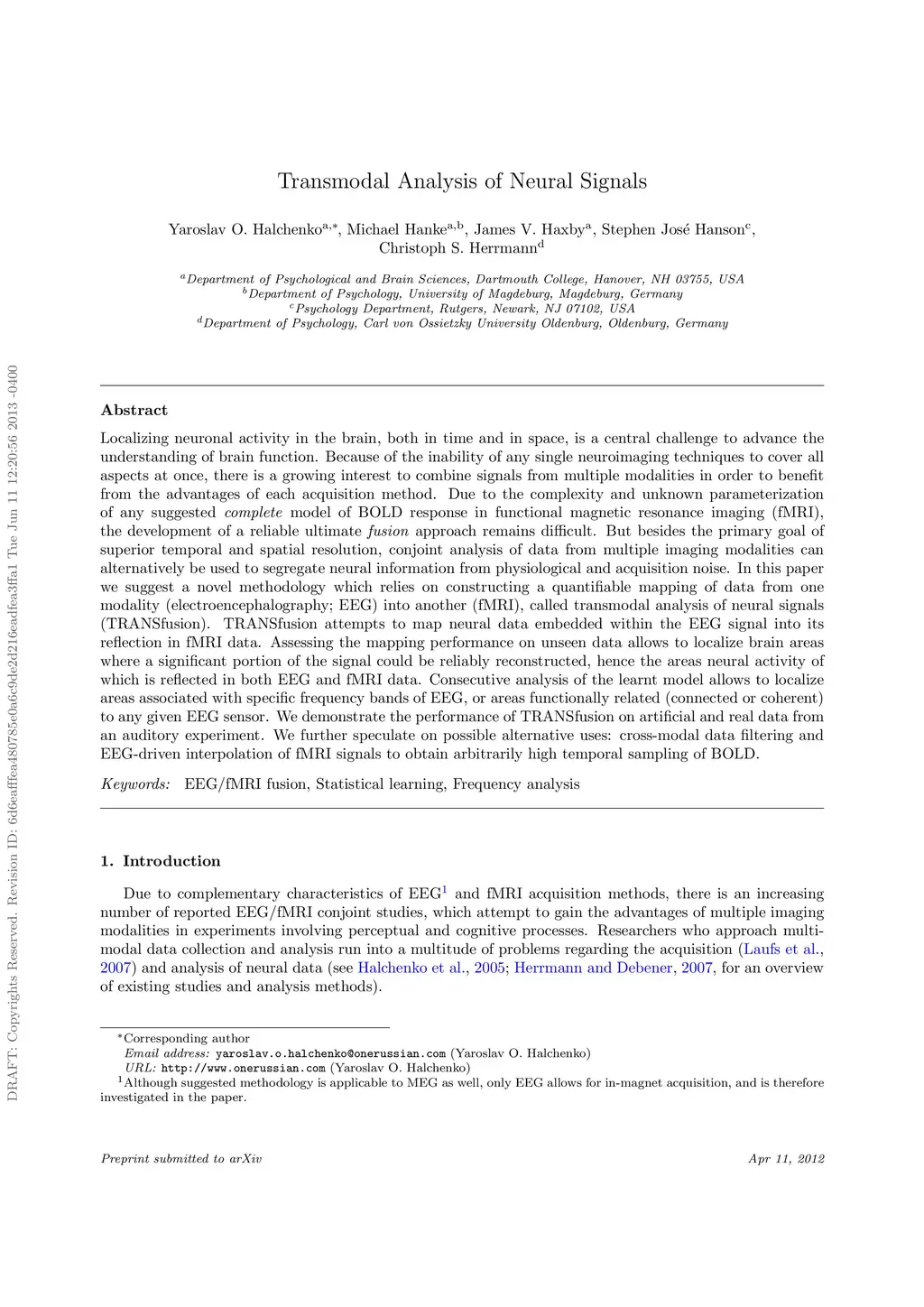 Localizing neuronal activity in the brain, both in time and in space, is a central challenge to advance the understanding of brain function. Because of the inability of any single neuroimaging techniques to cover all aspects at once, there is a growing interest to combine signals from multiple modalities in order to benefit from the advantages of each acquisition method. Due to the complexity and unknown parameterization of any suggested complete model of BOLD response in functional magnetic resonance imaging (fMRI), the development of a reliable ultimate fusion approach remains difficult. But besides the primary goal of superior temporal and spatial resolution, conjoint analysis of data from multiple imaging modalities can alternatively be used to segregate neural information from physiological and acquisition noise. In this paper we suggest a novel methodology which relies on constructing a quantifiable mapping of data from one modality (electroencephalography; EEG) into another (fMRI), called transmodal analysis of neural signals (TRANSfusion). TRANSfusion attempts to map neural data embedded within the EEG signal into its reflection in fMRI data. Assessing the mapping performance on unseen data allows to localize brain areas where a significant portion of the signal could be reliably reconstructed, hence the areas neural activity of which is reflected in both EEG and fMRI data. Consecutive analysis of the learnt model allows to localize areas associated with specific frequency bands of EEG, or areas functionally related (connected or coherent) to any given EEG sensor. We demonstrate the performance of TRANSfusion on artificial and real data from an auditory experiment. We further speculate on possible alternative uses: cross-modal data filtering and EEG-driven interpolation of fMRI signals to obtain arbitrarily high temporal sampling of BOLD.