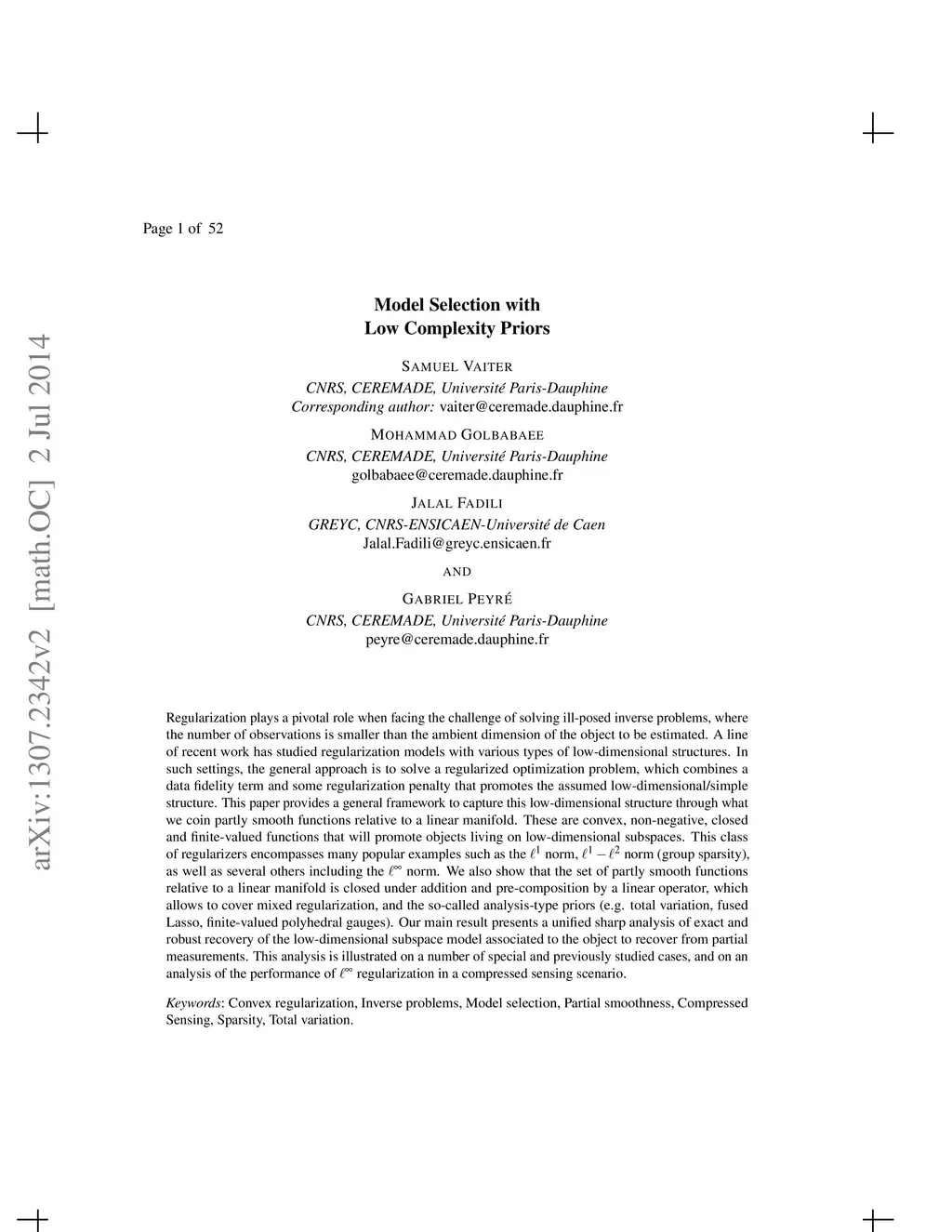 Regularization plays a pivotal role when facing the challenge of solving ill-posed inverse problems, where the number of observations is smaller than the ambient dimension of the object to be estimated. A line of recent work has studied regularization models with various types of low-dimensional structures. In such settings, the general approach is to solve a regularized optimization problem, which combines a data fidelity term and some regularization penalty that promotes the assumed low-dimensional/simple structure. This paper provides a general framework to capture this low-dimensional structure through what we coin partly smooth functions relative to a linear manifold. These are convex, non-negative, closed and finite-valued functions that will promote objects living on low-dimensional subspaces. This class of regularizers encompasses many popular examples such as the L1 norm, L1-L2 norm (group sparsity), as well as several others including the Linfty norm. We also show that the set of partly smooth functions relative to a linear manifold is closed under addition and pre-composition by a linear operator, which allows to cover mixed regularization, and the so-called analysis-type priors (e.g. total variation, fused Lasso, finite-valued polyhedral gauges). Our main result presents a unified sharp analysis of exact and robust recovery of the low-dimensional subspace model associated to the object to recover from partial measurements. This analysis is illustrated on a number of special and previously studied cases, and on an analysis of the performance of Linfty regularization in a compressed sensing scenario.