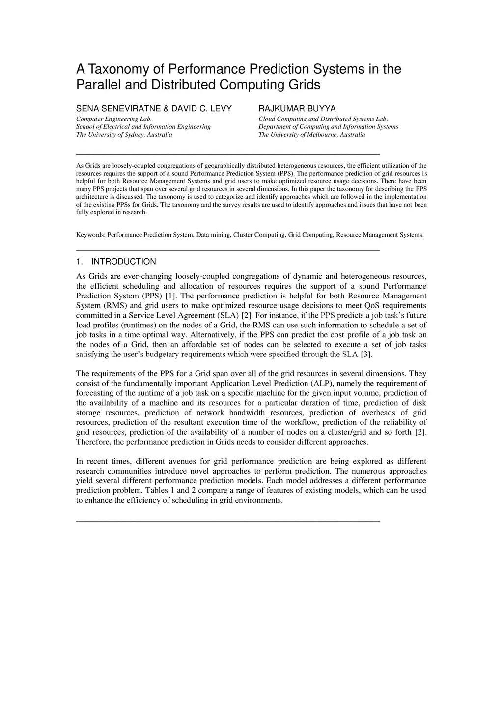As Grids are loosely-coupled congregations of geographically distributed heterogeneous resources, the efficient utilization of the resources requires the support of a sound Performance Prediction System (PPS). The performance prediction of grid resources is helpful for both Resource Management Systems and grid users to make optimized resource usage decisions. There have been many PPS projects that span over several grid resources in several dimensions. In this paper the taxonomy for describing the PPS architecture is discussed. The taxonomy is used to categorize and identify approaches which are followed in the implementation of the existing PPSs for Grids. The taxonomy and the survey results are used to identify approaches and issues that have not been fully explored in research.