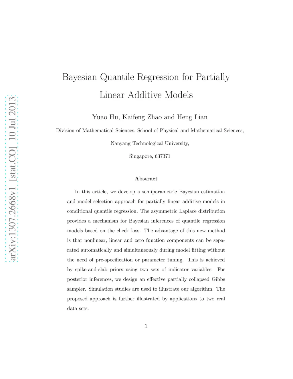 In this article, we develop a semiparametric Bayesian estimation and model selection approach for partially linear additive models in conditional quantile regression. The asymmetric Laplace distribution provides a mechanism for Bayesian inferences of quantile regression models based on the check loss. The advantage of this new method is that nonlinear, linear and zero function components can be separated automatically and simultaneously during model fitting without the need of pre-specification or parameter tuning. This is achieved by spike-and-slab priors using two sets of indicator variables. For posterior inferences, we design an effective partially collapsed Gibbs sampler. Simulation studies are used to illustrate our algorithm. The proposed approach is further illustrated by applications to two real data sets.