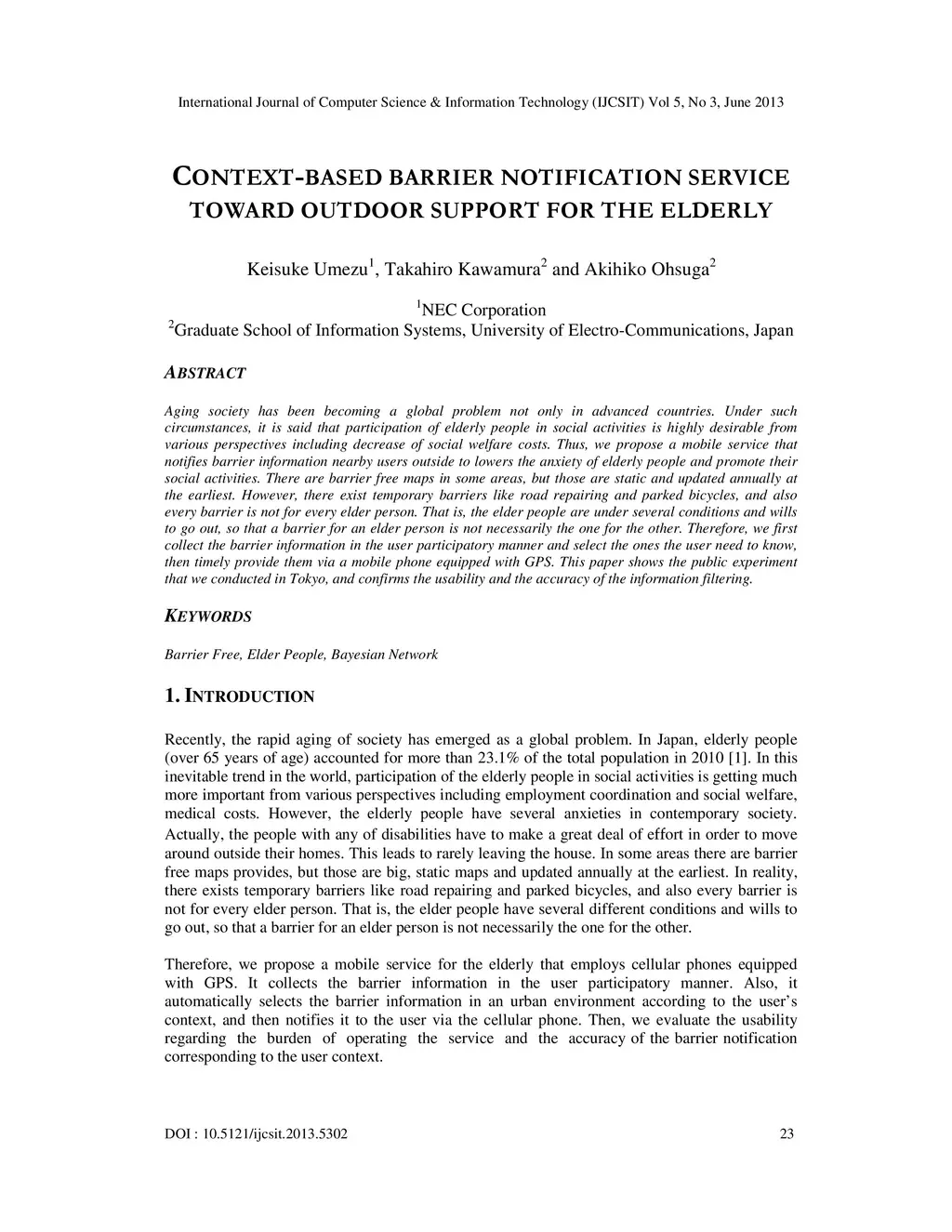Aging society has been becoming a global problem not only in advanced countries. Under such circumstances, it is said that participation of elderly people in social activities is highly desirable from various perspectives including decrease of social welfare costs. Thus, we propose a mobile service that notifies barrier information nearby users outside to lowers the anxiety of elderly people and promote their social activities. There are barrier free maps in some areas, but those are static and updated annually at the earliest. However, there exist temporary barriers like road repairing and parked bicycles, and also every barrier is not for every elder person. That is, the elder people are under several conditions and wills to go out, so that a barrier for an elder person is not necessarily the one for the other. Therefore, we first collect the barrier information in the user participatory manner and select the ones the user need to know, then timely provide them via a mobile phone equipped with GPS. This paper shows the public experiment that we conducted in Tokyo, and confirms the usability and the accuracy of the information filtering.