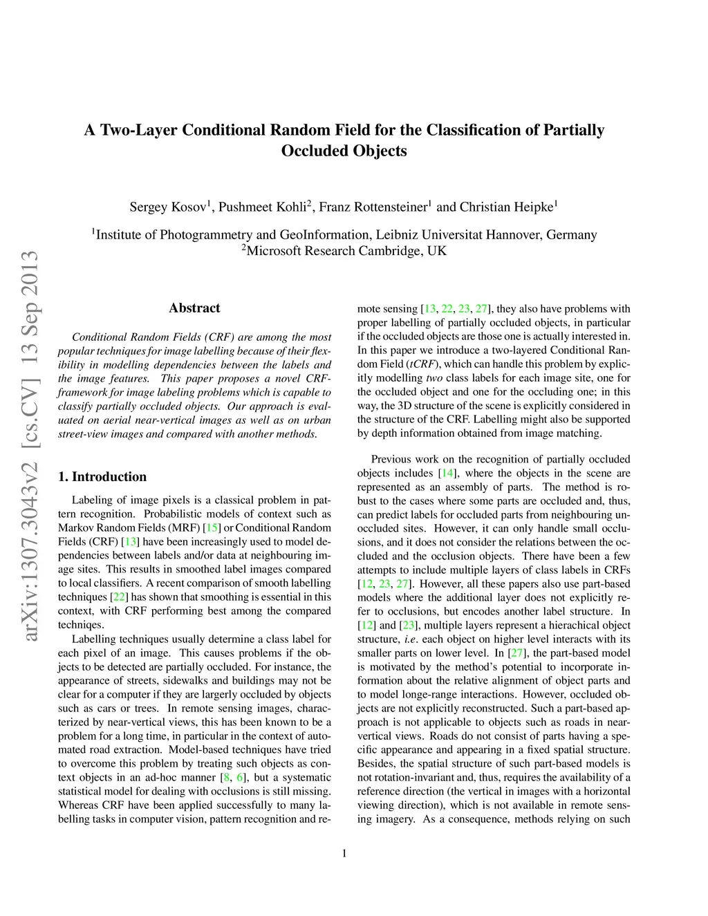 Conditional Random Fields (CRF) are among the most popular techniques for image labelling because of their flexibility in modelling dependencies between the labels and the image features. This paper proposes a novel CRF-framework for image labeling problems which is capable to classify partially occluded objects. Our approach is evaluated on aerial near-vertical images as well as on urban street-view images and compared with another methods.