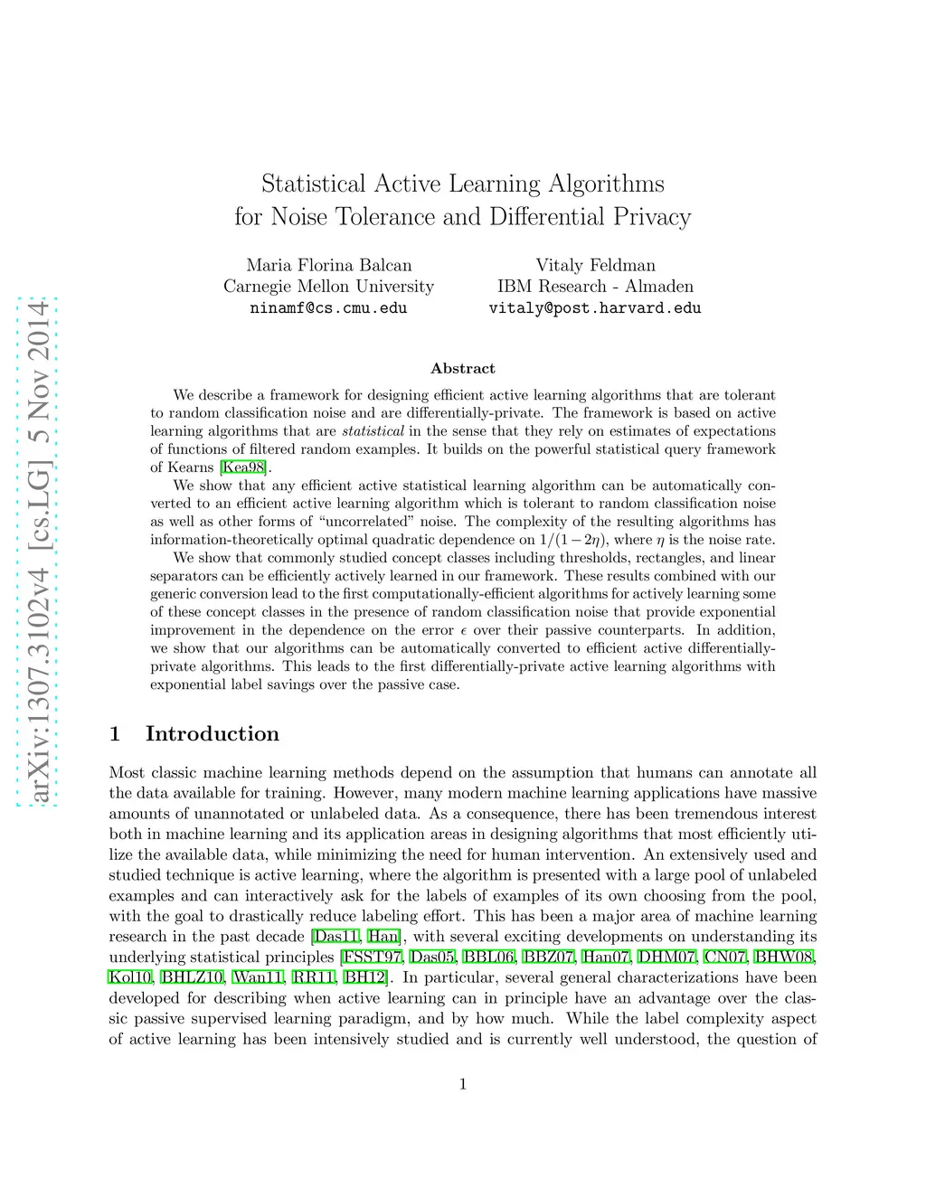 We describe a framework for designing efficient active learning algorithms that are tolerant to random classification noise and are differentially-private. The framework is based on active learning algorithms that are statistical in the sense that they rely on estimates of expectations of functions of filtered random examples. It builds on the powerful statistical query framework of Kearns (1993). We show that any efficient active statistical learning algorithm can be automatically converted to an efficient active learning algorithm which is tolerant to random classification noise as well as other forms of "uncorrelated" noise. The complexity of the resulting algorithms has information-theoretically optimal quadratic dependence on , where is the noise rate. We show that commonly studied concept classes including thresholds, rectangles, and linear separators can be efficiently actively learned in our framework. These results combined with our generic conversion lead to the first computationally-efficient algorithms for actively learning some of these concept classes in the presence of random classification noise that provide exponential improvement in the dependence on the error over their passive counterparts. In addition, we show that our algorithms can be automatically converted to efficient active differentially-private algorithms. This leads to the first differentially-private active learning algorithms with exponential label savings over the passive case.