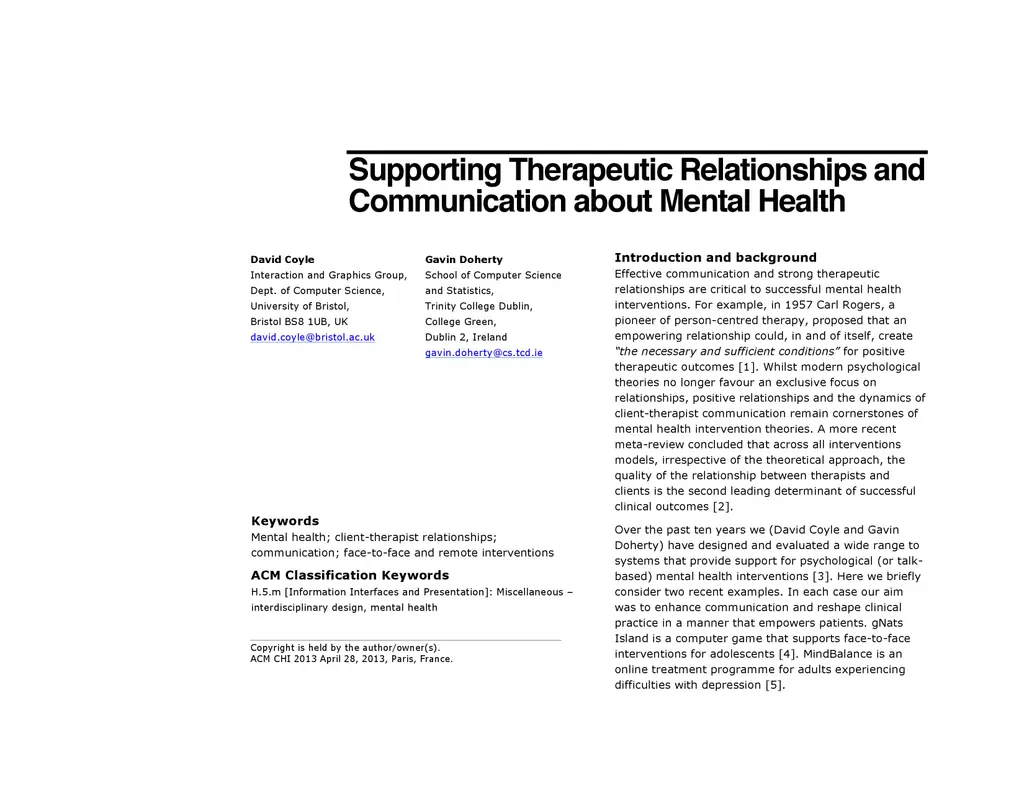 Effective communication and strong therapeutic relationships are critical to successful mental health interventions. For example, in 1957 Carl Rogers, a pioneer of person-centred therapy, proposed that an empowering relationship could, in and of itself, create the necessary and sufficient conditions for positive therapeutic outcomes [1]. Whilst modern psychological theories no longer favour an exclusive focus on relationships, positive relationships and the dynamics of client-therapist communication remain cornerstones of mental health intervention theories. A more recent meta-review concluded that across all interventions models, irrespective of the theoretical approach, the quality of the relationship between therapists and clients is the second leading determinant of successful clinical outcomes [2]. Over the past ten years we (David Coyle and Gavin Doherty) have designed and evaluated a wide range to systems that provide support for psychological (or talk- based) mental health interventions [3]. Here we briefly consider two recent examples. In each case our aim was to enhance communication and reshape clinical practice in a manner that empowers patients. gNats Island is a computer game that supports face-to-face interventions for adolescents [4]. MindBalance is an online treatment programme for adults experiencing difficulties with depression [5].