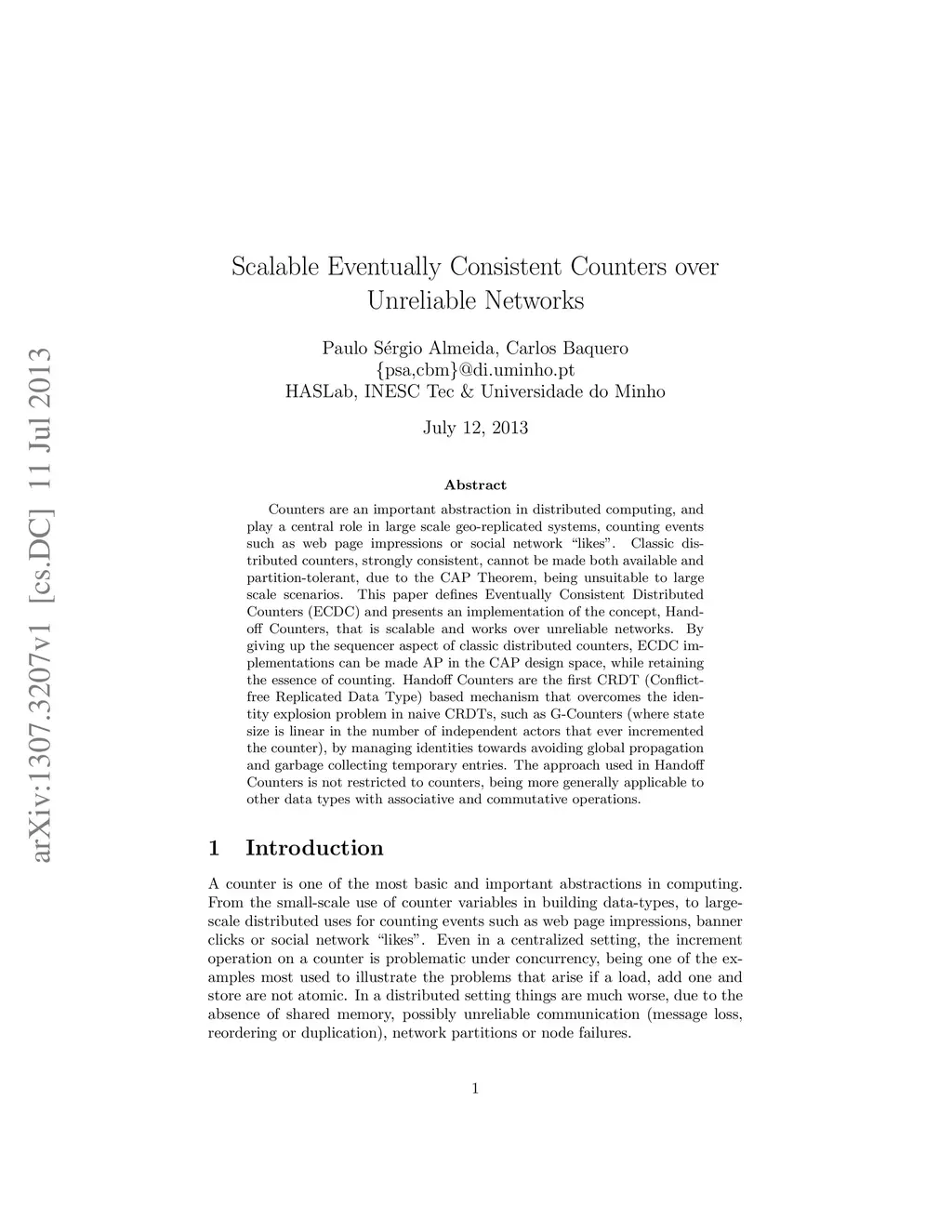 Counters are an important abstraction in distributed computing, and play a central role in large scale geo-replicated systems, counting events such as web page impressions or social network "likes". Classic distributed counters, strongly consistent, cannot be made both available and partition-tolerant, due to the CAP Theorem, being unsuitable to large scale scenarios. This paper defines Eventually Consistent Distributed Counters (ECDC) and presents an implementation of the concept, Handoff Counters, that is scalable and works over unreliable networks. By giving up the sequencer aspect of classic distributed counters, ECDC implementations can be made AP in the CAP design space, while retaining the essence of counting. Handoff Counters are the first CRDT (Conflict-free Replicated Data Type) based mechanism that overcomes the identity explosion problem in naive CRDTs, such as G-Counters (where state size is linear in the number of independent actors that ever incremented the counter), by managing identities towards avoiding global propagation and garbage collecting temporary entries. The approach used in Handoff Counters is not restricted to counters, being more generally applicable to other data types with associative and commutative operations.