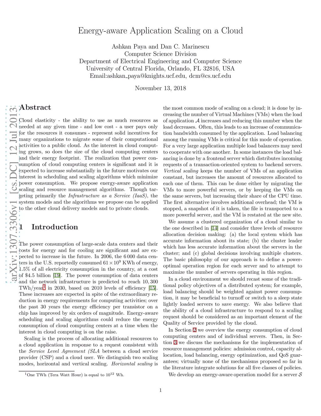 Cloud elasticity - the ability to use as much resources as needed at any given time - and low cost - a user pays only for the resources it consumes - represent solid incentives for many organizations to migrate some of their computational activities to a public cloud. As the interest in cloud computing grows, so does the size of the cloud computing centers and their energy footprint. The realization that power consumption of cloud computing centers is significant and it is expected to increase substantially in the future motivates our interest in scheduling and scaling algorithms which minimize power consumption. We propose energy-aware application scaling and resource management algorithms. Though targeting primarily the Infrastructure as a Service (IaaS), the system models and the algorithms we propose can be applied to the other cloud delivery models and to private clouds.
