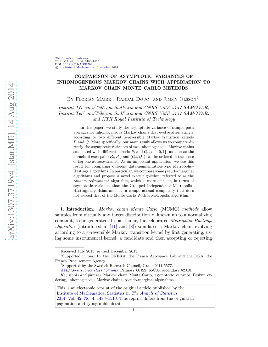 In this paper, we study the asymptotic variance of sample path averages for inhomogeneous Markov chains that evolve alternatingly according to two different -reversible Markov transition kernels and . More specifically, our main result allows us to compare directly the asymptotic variances of two inhomogeneous Markov chains associated with different kernels and , , as soon as the kernels of each pair and can be ordered in the sense of lag-one autocovariance. As an important application, we use this result for comparing different data-augmentation-type Metropolis-Hastings algorithms. In particular, we compare some pseudo-marginal algorithms and propose a novel exact algorithm, referred to as the random refreshment algorithm, which is more efficient, in terms of asymptotic variance, than the Grouped Independence Metropolis-Hastings algorithm and has a computational complexity that does not exceed that of the Monte Carlo Within Metropolis algorithm.