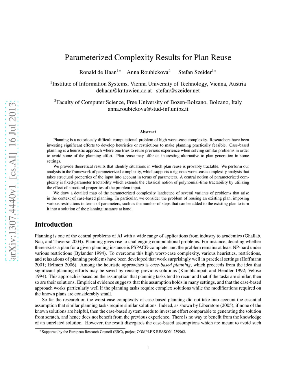 Planning is a notoriously difficult computational problem of high worst-case complexity. Researchers have been investing significant efforts to develop heuristics or restrictions to make planning practically feasible. Case-based planning is a heuristic approach where one tries to reuse previous experience when solving similar problems in order to avoid some of the planning effort. Plan reuse may offer an interesting alternative to plan generation in some settings. We provide theoretical results that identify situations in which plan reuse is provably tractable. We perform our analysis in the framework of parameterized complexity, which supports a rigorous worst-case complexity analysis that takes structural properties of the input into account in terms of parameters. A central notion of parameterized complexity is fixed-parameter tractability which extends the classical notion of polynomial-time tractability by utilizing the effect of structural properties of the problem input. We draw a detailed map of the parameterized complexity landscape of several variants of problems that arise in the context of case-based planning. In particular, we consider the problem of reusing an existing plan, imposing various restrictions in terms of parameters, such as the number of steps that can be added to the existing plan to turn it into a solution of the planning instance at hand.