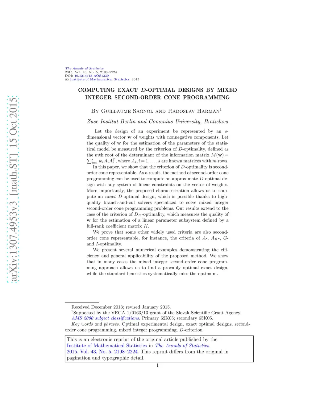 Let the design of an experiment be represented by an -dimensional vector of weights with nonnegative components. Let the quality of for the estimation of the parameters of the statistical model be measured by the criterion of -optimality, defined as the th root of the determinant of the information matrix , where are known matrices with rows. In this paper, we show that the criterion of -optimality is second-order cone representable. As a result, the method of second-order cone programming can be used to compute an approximate -optimal design with any system of linear constraints on the vector of weights. More importantly, the proposed characterization allows us to compute an exact -optimal design, which is possible thanks to high-quality branch-and-cut solvers specialized to solve mixed integer second-order cone programming problems. Our results extend to the case of the criterion of -optimality, which measures the quality of for the estimation of a linear parameter subsystem defined by a full-rank coefficient matrix . We prove that some other widely used criteria are also second-order cone representable, for instance, the criteria of -, -, - and -optimality. We present several numerical examples demonstrating the efficiency and general applicability of the proposed method. We show that in many cases the mixed integer second-order cone programming approach allows us to find a provably optimal exact design, while the standard heuristics systematically miss the optimum.
