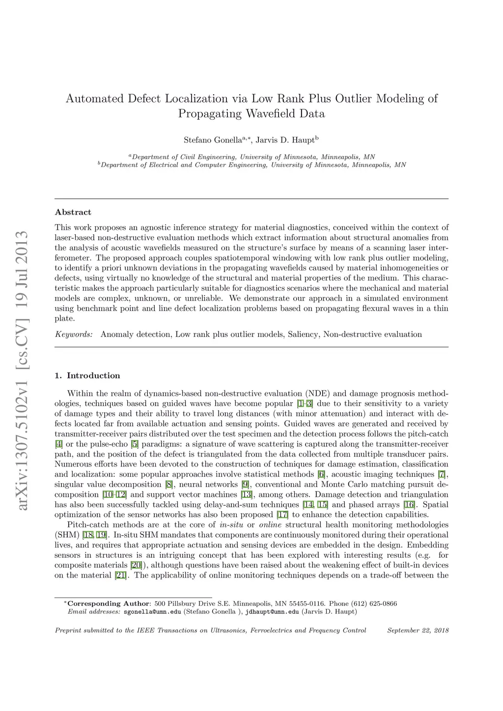 Automated Defect Localization via Low Rank Plus Outlier Modeling of