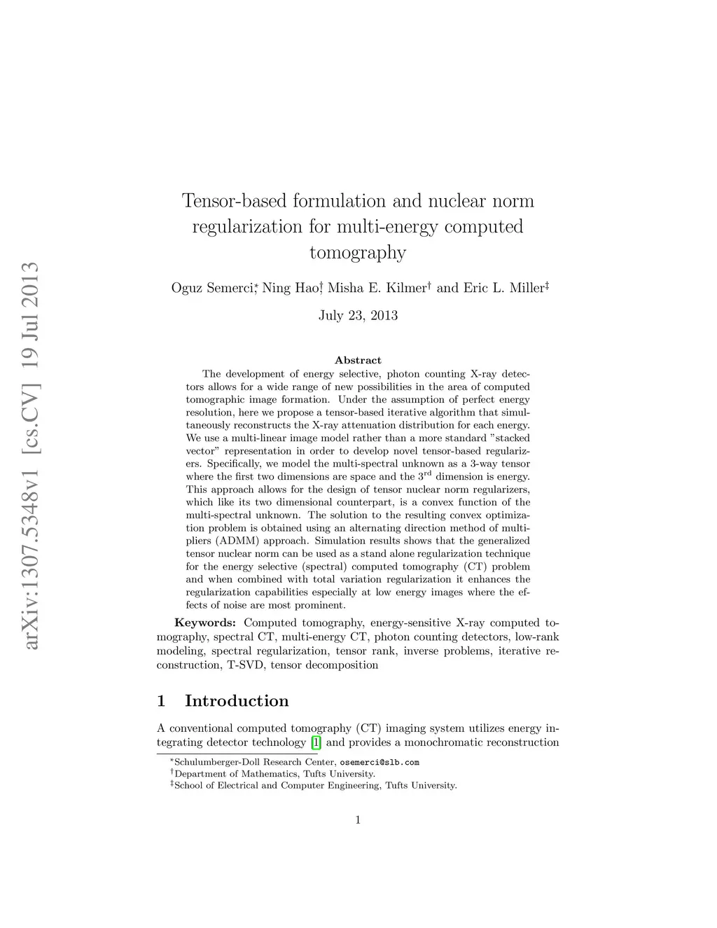 The development of energy selective, photon counting X-ray detectors allows for a wide range of new possibilities in the area of computed tomographic image formation. Under the assumption of perfect energy resolution, here we propose a tensor-based iterative algorithm that simultaneously reconstructs the X-ray attenuation distribution for each energy. We use a multi-linear image model rather than a more standard "stacked vector" representation in order to develop novel tensor-based regularizers. Specifically, we model the multi-spectral unknown as a 3-way tensor where the first two dimensions are space and the third dimension is energy. This approach allows for the design of tensor nuclear norm regularizers, which like its two dimensional counterpart, is a convex function of the multi-spectral unknown. The solution to the resulting convex optimization problem is obtained using an alternating direction method of multipliers (ADMM) approach. Simulation results shows that the generalized tensor nuclear norm can be used as a stand alone regularization technique for the energy selective (spectral) computed tomography (CT) problem and when combined with total variation regularization it enhances the regularization capabilities especially at low energy images where the effects of noise are most prominent.