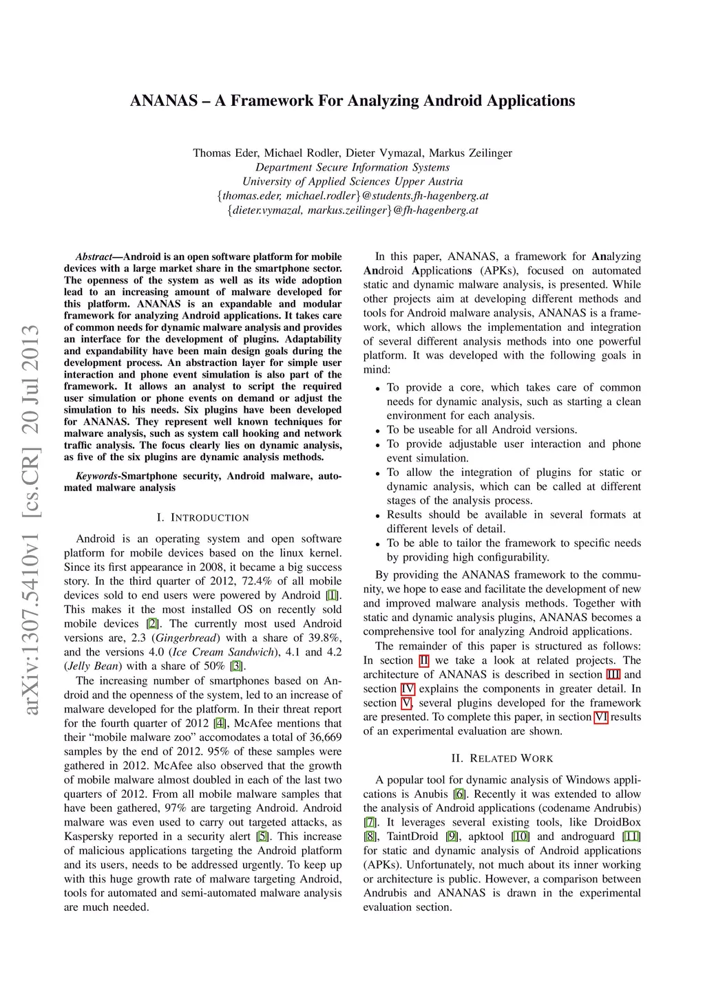 Android is an open software platform for mobile devices with a large market share in the smartphone sector. The openness of the system as well as its wide adoption lead to an increasing amount of malware developed for this platform. ANANAS is an expandable and modular framework for analyzing Android applications. It takes care of common needs for dynamic malware analysis and provides an interface for the development of plugins. Adaptability and expandability have been main design goals during the development process. An abstraction layer for simple user interaction and phone event simulation is also part of the framework. It allows an analyst to script the required user simulation or phone events on demand or adjust the simulation to his needs. Six plugins have been developed for ANANAS. They represent well known techniques for malware analysis, such as system call hooking and network traffic analysis. The focus clearly lies on dynamic analysis, as five of the six plugins are dynamic analysis methods.