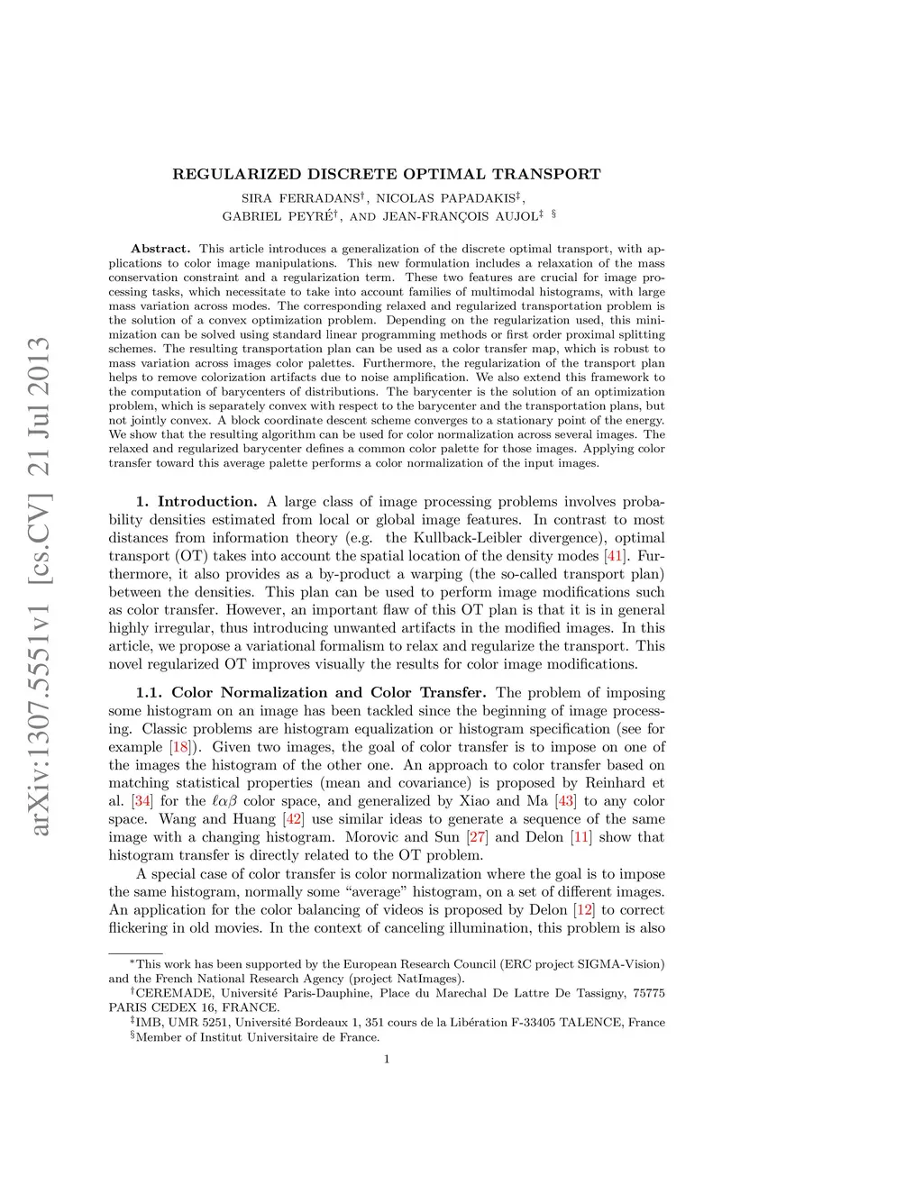 This article introduces a generalization of the discrete optimal transport, with applications to color image manipulations. This new formulation includes a relaxation of the mass conservation constraint and a regularization term. These two features are crucial for image processing tasks, which necessitate to take into account families of multimodal histograms, with large mass variation across modes. The corresponding relaxed and regularized transportation problem is the solution of a convex optimization problem. Depending on the regularization used, this minimization can be solved using standard linear programming methods or first order proximal splitting schemes. The resulting transportation plan can be used as a color transfer map, which is robust to mass variation across images color palettes. Furthermore, the regularization of the transport plan helps to remove colorization artifacts due to noise amplification. We also extend this framework to the computation of barycenters of distributions. The barycenter is the solution of an optimization problem, which is separately convex with respect to the barycenter and the transportation plans, but not jointly convex. A block coordinate descent scheme converges to a stationary point of the energy. We show that the resulting algorithm can be used for color normalization across several images. The relaxed and regularized barycenter defines a common color palette for those images. Applying color transfer toward this average palette performs a color normalization of the input images.