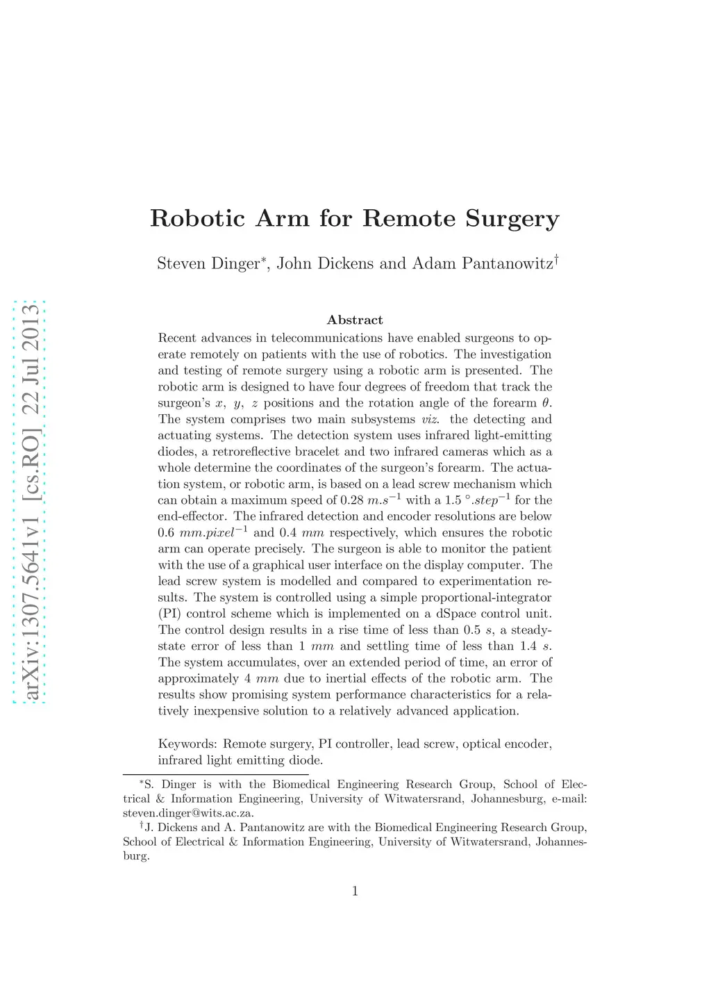 Recent advances in telecommunications have enabled surgeons to operate remotely on patients with the use of robotics. The investigation and testing of remote surgery using a robotic arm is presented. The robotic arm is designed to have four degrees of freedom that track the surgeon's x, y, z positions and the rotation angle of the forearm {\theta}. The system comprises two main subsystems viz. the detecting and actuating systems. The detection system uses infrared light-emitting diodes, a retroreflective bracelet and two infrared cameras which as a whole determine the coordinates of the surgeon's forearm. The actuation system, or robotic arm, is based on a lead screw mechanism which can obtain a maximum speed of 0.28 m/s with a 1.5 degree/step for the end-effector. The infrared detection and encoder resolutions are below 0.6 mm/pixel and 0.4 mm respectively, which ensures the robotic arm can operate precisely. The surgeon is able to monitor the patient with the use of a graphical user interface on the display computer. The lead screw system is modelled and compared to experimentation results. The system is controlled using a simple proportional-integrator (PI) control scheme which is implemented on a dSpace control unit. The control design results in a rise time of less than 0.5 s, a steady-state error of less than 1 mm and settling time of less than 1.4 s. The system accumulates, over an extended period of time, an error of approximately 4 mm due to inertial effects of the robotic arm. The results show promising system performance characteristics for a relatively inexpensive solution to a relatively advanced application.