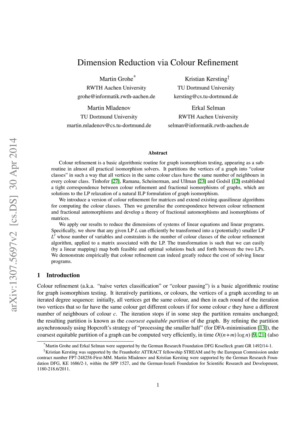 Colour refinement is a basic algorithmic routine for graph isomorphism testing, appearing as a subroutine in almost all practical isomorphism solvers. It partitions the vertices of a graph into "colour classes" in such a way that all vertices in the same colour class have the same number of neighbours in every colour class. Tinhofer (Disc. App. Math., 1991), Ramana, Scheinerman, and Ullman (Disc. Math., 1994) and Godsil (Lin. Alg. and its App., 1997) established a tight correspondence between colour refinement and fractional isomorphisms of graphs, which are solutions to the LP relaxation of a natural ILP formulation of graph isomorphism. We introduce a version of colour refinement for matrices and extend existing quasilinear algorithms for computing the colour classes. Then we generalise the correspondence between colour refinement and fractional automorphisms and develop a theory of fractional automorphisms and isomorphisms of matrices. We apply our results to reduce the dimensions of systems of linear equations and linear programs. Specifically, we show that any given LP L can efficiently be transformed into a (potentially) smaller LP L' whose number of variables and constraints is the number of colour classes of the colour refinement algorithm, applied to a matrix associated with the LP. The transformation is such that we can easily (by a linear mapping) map both feasible and optimal solutions back and forth between the two LPs. We demonstrate empirically that colour refinement can indeed greatly reduce the cost of solving linear programs.