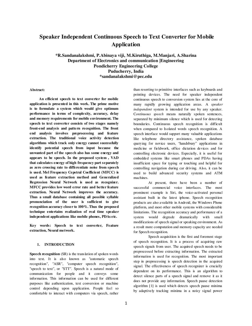 An efficient speech to text converter for mobile application is presented in this work. The prime motive is to formulate a system which would give optimum performance in terms of complexity, accuracy, delay and memory requirements for mobile environment. The speech to text converter consists of two stages namely front-end analysis and pattern recognition. The front end analysis involves preprocessing and feature extraction. The traditional voice activity detection algorithms which track only energy cannot successfully identify potential speech from input because the unwanted part of the speech also has some energy and appears to be speech. In the proposed system, VAD that calculates energy of high frequency part separately as zero crossing rate to differentiate noise from speech is used. Mel Frequency Cepstral Coefficient (MFCC) is used as feature extraction method and Generalized Regression Neural Network is used as recognizer. MFCC provides low word error rate and better feature extraction. Neural Network improves the accuracy. Thus a small database containing all possible syllable pronunciation of the user is sufficient to give recognition accuracy closer to 100%. Thus the proposed technique entertains realization of real time speaker independent applications like mobile phones, PDAs etc.