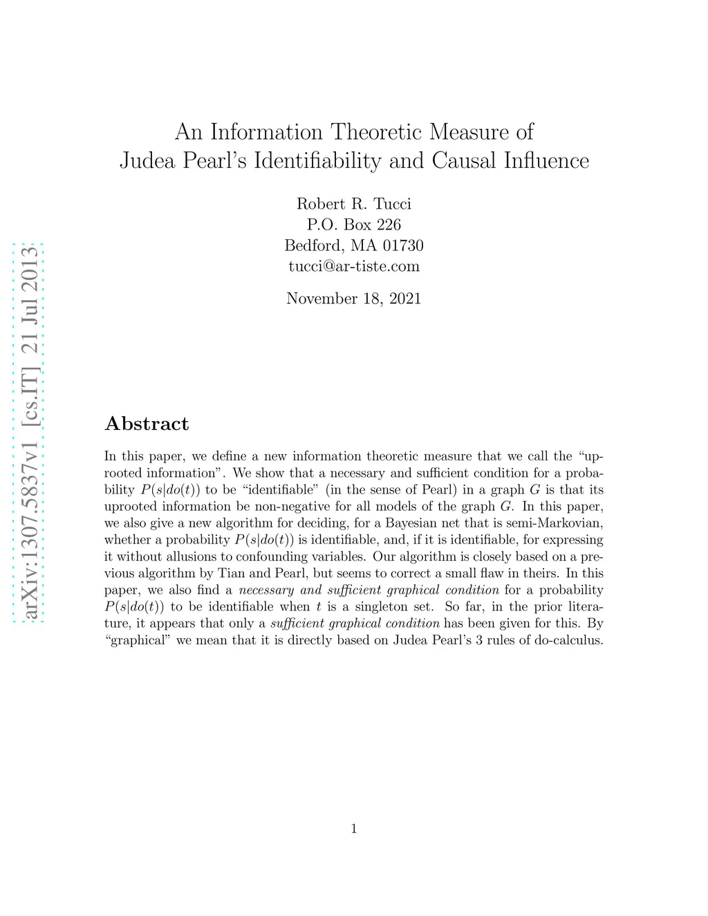 In this paper, we define a new information theoretic measure that we call the "uprooted information". We show that a necessary and sufficient condition for a probability to be "identifiable" (in the sense of Pearl) in a graph is that its uprooted information be non-negative for all models of the graph . In this paper, we also give a new algorithm for deciding, for a Bayesian net that is semi-Markovian, whether a probability is identifiable, and, if it is identifiable, for expressing it without allusions to confounding variables. Our algorithm is closely based on a previous algorithm by Tian and Pearl, but seems to correct a small flaw in theirs. In this paper, we also find a {\it necessary and sufficient graphical condition} for a probability to be identifiable when is a singleton set. So far, in the prior literature, it appears that only a {\it sufficient graphical condition} has been given for this. By "graphical" we mean that it is directly based on Judea Pearl's 3 rules of do-calculus.