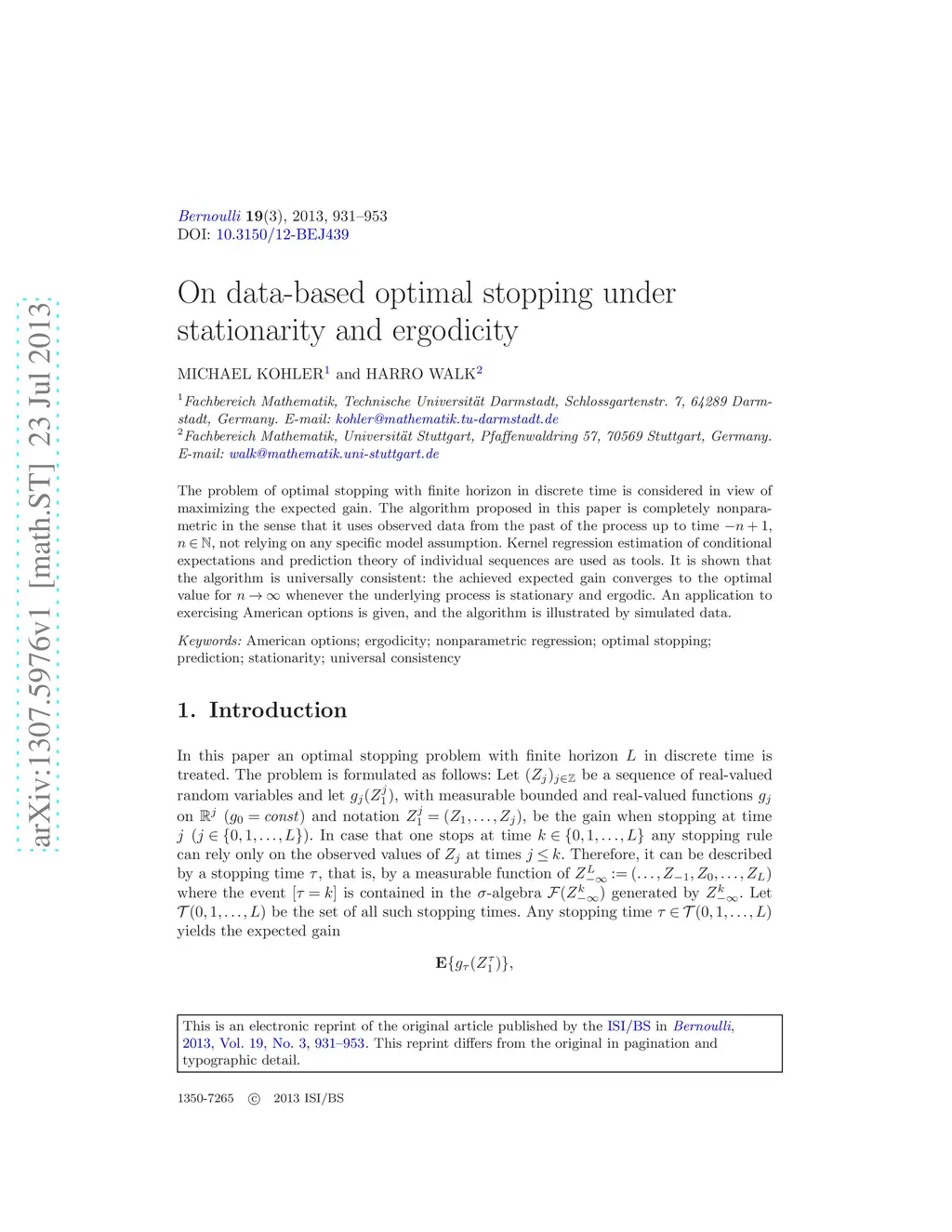 The problem of optimal stopping with finite horizon in discrete time is considered in view of maximizing the expected gain. The algorithm proposed in this paper is completely nonparametric in the sense that it uses observed data from the past of the process up to time , , not relying on any specific model assumption. Kernel regression estimation of conditional expectations and prediction theory of individual sequences are used as tools. It is shown that the algorithm is universally consistent: the achieved expected gain converges to the optimal value for whenever the underlying process is stationary and ergodic. An application to exercising American options is given, and the algorithm is illustrated by simulated data.