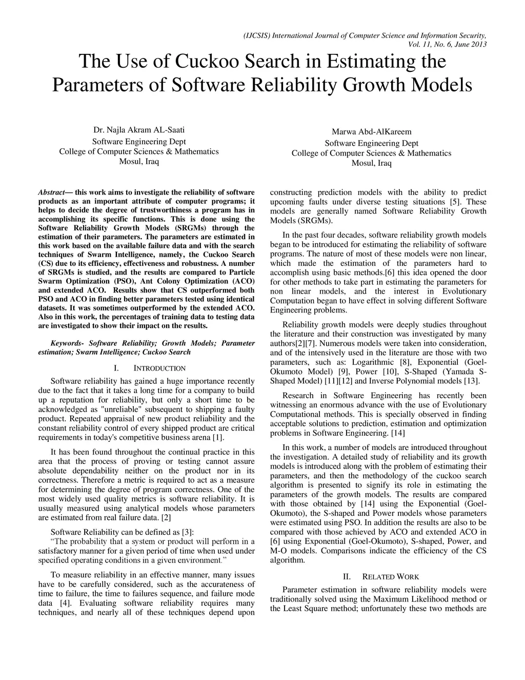 This work aims to investigate the reliability of software products as an important attribute of computer programs; it helps to decide the degree of trustworthiness a program has in accomplishing its specific functions. This is done using the Software Reliability Growth Models (SRGMs) through the estimation of their parameters. The parameters are estimated in this work based on the available failure data and with the search techniques of Swarm Intelligence, namely, the Cuckoo Search (CS) due to its efficiency, effectiveness and robustness. A number of SRGMs is studied, and the results are compared to Particle Swarm Optimization (PSO), Ant Colony Optimization (ACO) and extended ACO. Results show that CS outperformed both PSO and ACO in finding better parameters tested using identical datasets. It was sometimes outperformed by the extended ACO. Also in this work, the percentages of training data to testing data are investigated to show their impact on the results.