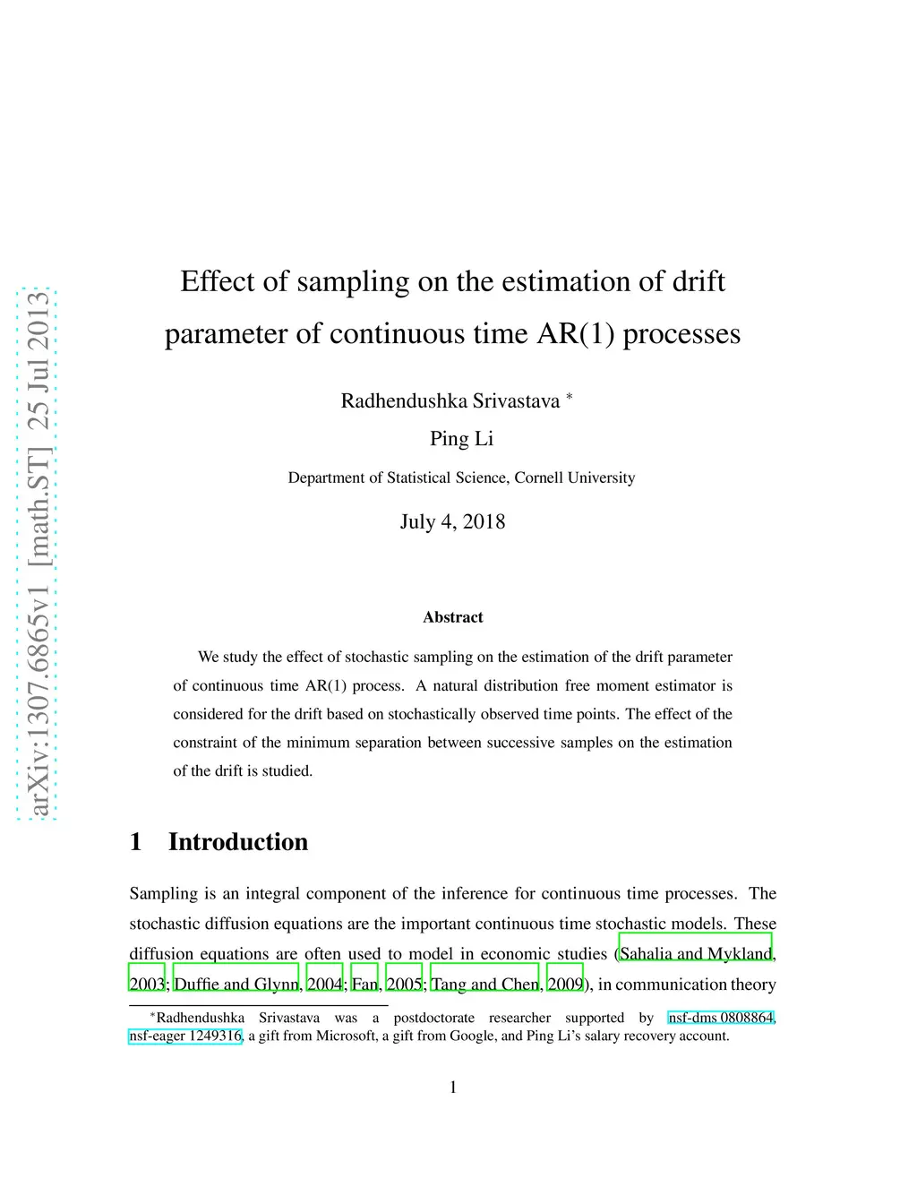We study the effect of stochastic sampling on the estimation of the drift parameter of continuous time AR(1) process. A natural distribution free moment estimator is considered for the drift based on stochastically observed time points. The effect of the constraint of the minimum separation between successive samples on the estimation of the drift is studied.
