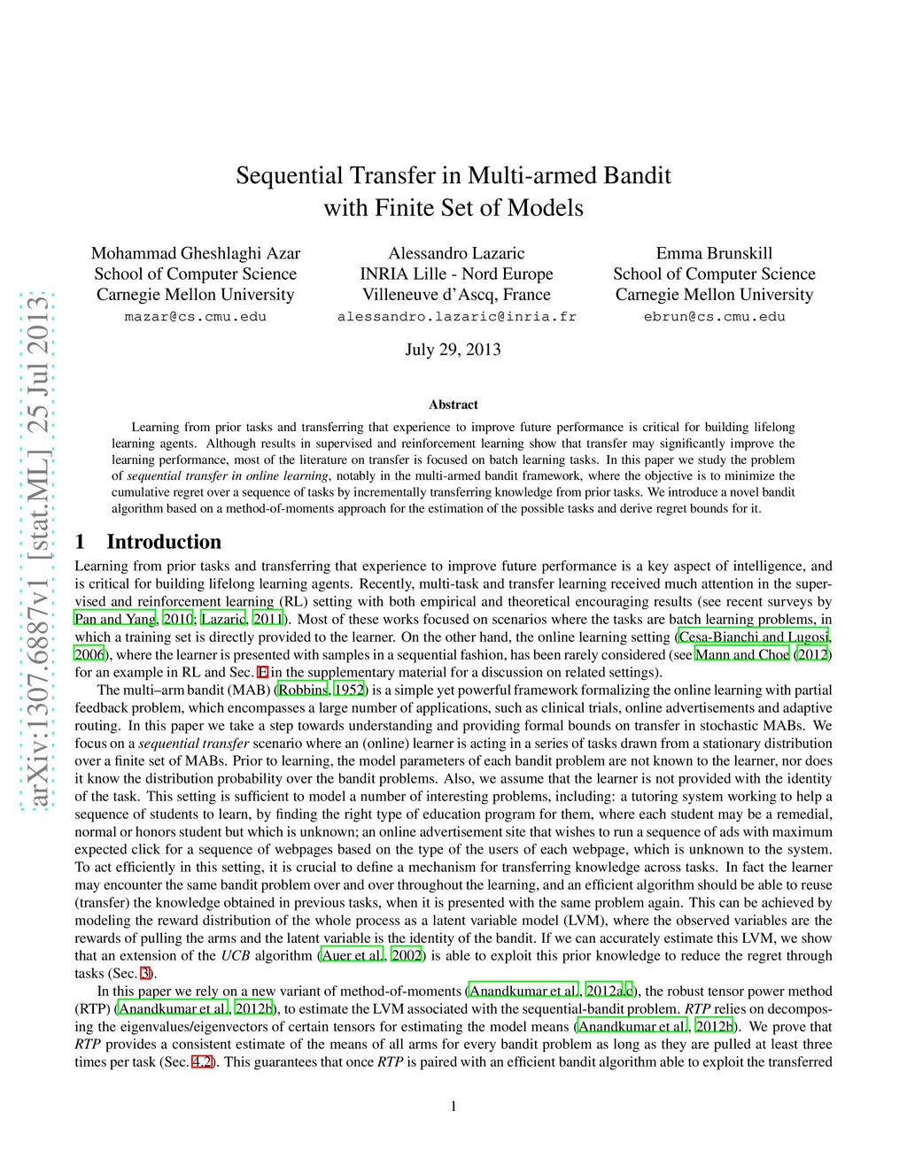 Sequential Transfer in Multi-armed Bandit with Finite Set of Models