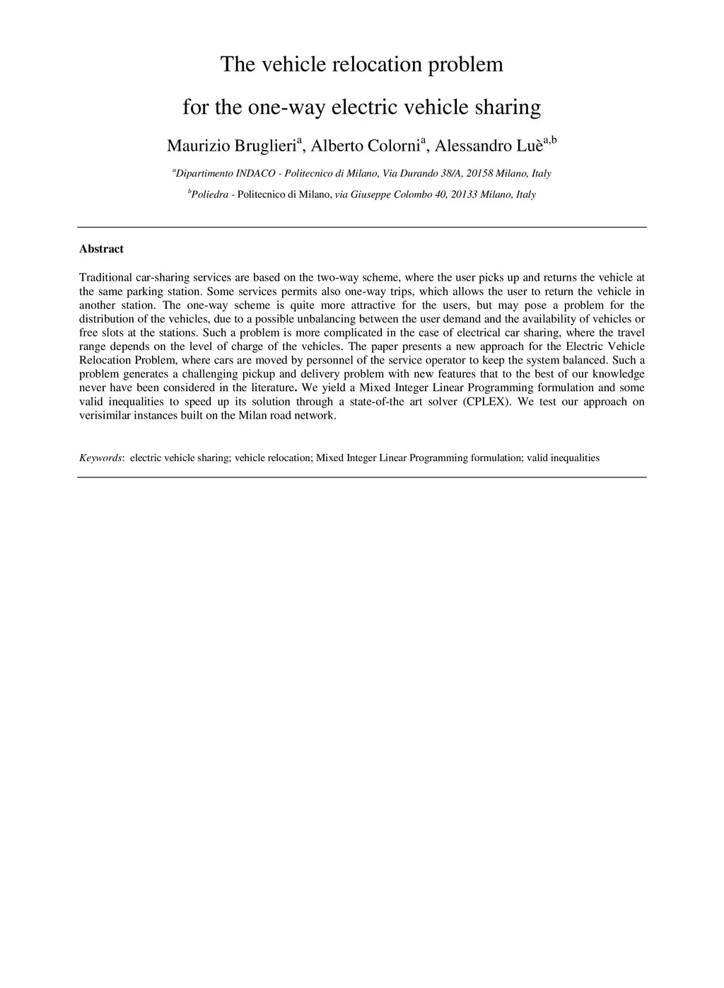Traditional car-sharing services are based on the two-way scheme, where the user picks up and returns the vehicle at the same parking station. Some services permits also one-way trips, which allows the user to return the vehicle in another station. The one-way scheme is quite more attractive for the users, but may pose a problem for the distribution of the vehicles, due to a possible unbalancing between the user demand and the availability of vehicles or free slots at the stations. Such a problem is more complicated in the case of electrical car sharing, where the travel range depends on the level of charge of the vehicles. The paper presents a new approach for the Electric Vehicle Relocation Problem, where cars are moved by personnel of the service operator to keep the system balanced. Such a problem generates a challenging pickup and delivery problem with new features that to the best of our knowledge never have been considered in the literature. We yield a Mixed Integer Linear Programming formulation and some valid inequalities to speed up its solution through a state-of-the art solver (CPLEX). We test our approach on verisimilar instances built on the Milan road network.