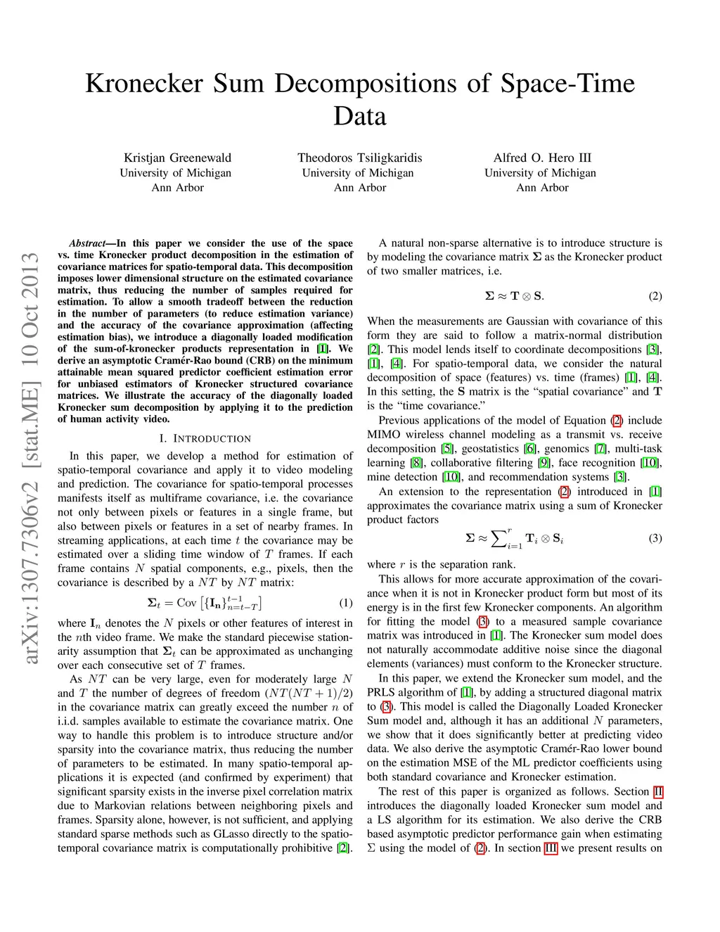 In this paper we consider the use of the space vs. time Kronecker product decomposition in the estimation of covariance matrices for spatio-temporal data. This decomposition imposes lower dimensional structure on the estimated covariance matrix, thus reducing the number of samples required for estimation. To allow a smooth tradeoff between the reduction in the number of parameters (to reduce estimation variance) and the accuracy of the covariance approximation (affecting estimation bias), we introduce a diagonally loaded modification of the sum of kronecker products representation [1]. We derive a Cramer-Rao bound (CRB) on the minimum attainable mean squared predictor coefficient estimation error for unbiased estimators of Kronecker structured covariance matrices. We illustrate the accuracy of the diagonally loaded Kronecker sum decomposition by applying it to video data of human activity.