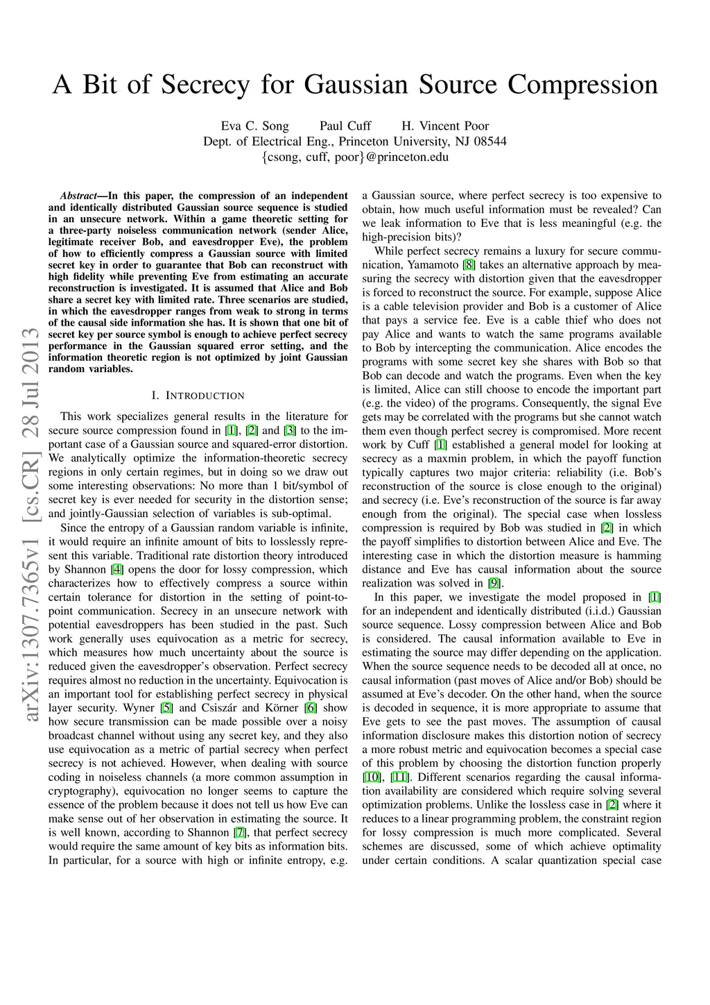 In this paper, the compression of an independent and identically distributed Gaussian source sequence is studied in an unsecure network. Within a game theoretic setting for a three-party noiseless communication network (sender Alice, legitimate receiver Bob, and eavesdropper Eve), the problem of how to efficiently compress a Gaussian source with limited secret key in order to guarantee that Bob can reconstruct with high fidelity while preventing Eve from estimating an accurate reconstruction is investigated. It is assumed that Alice and Bob share a secret key with limited rate. Three scenarios are studied, in which the eavesdropper ranges from weak to strong in terms of the causal side information she has. It is shown that one bit of secret key per source symbol is enough to achieve perfect secrecy performance in the Gaussian squared error setting, and the information theoretic region is not optimized by joint Gaussian random variables.