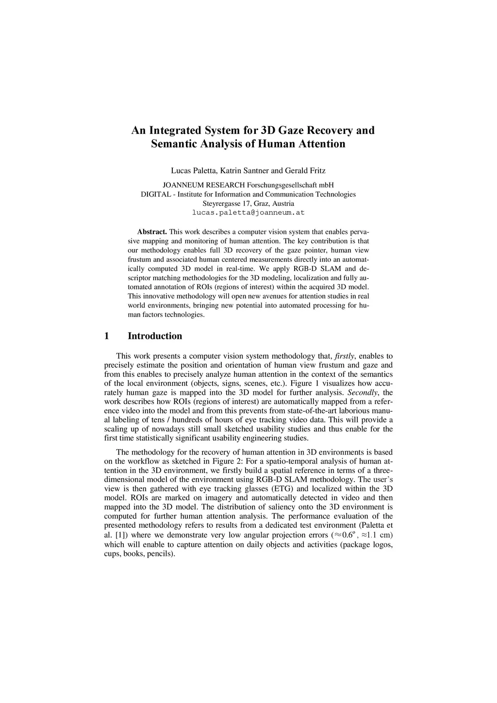 This work describes a computer vision system that enables pervasive mapping and monitoring of human attention. The key contribution is that our methodology enables full 3D recovery of the gaze pointer, human view frustum and associated human centered measurements directly into an automatically computed 3D model in real-time. We apply RGB-D SLAM and descriptor matching methodologies for the 3D modeling, localization and fully automated annotation of ROIs (regions of interest) within the acquired 3D model. This innovative methodology will open new avenues for attention studies in real world environments, bringing new potential into automated processing for human factors technologies.