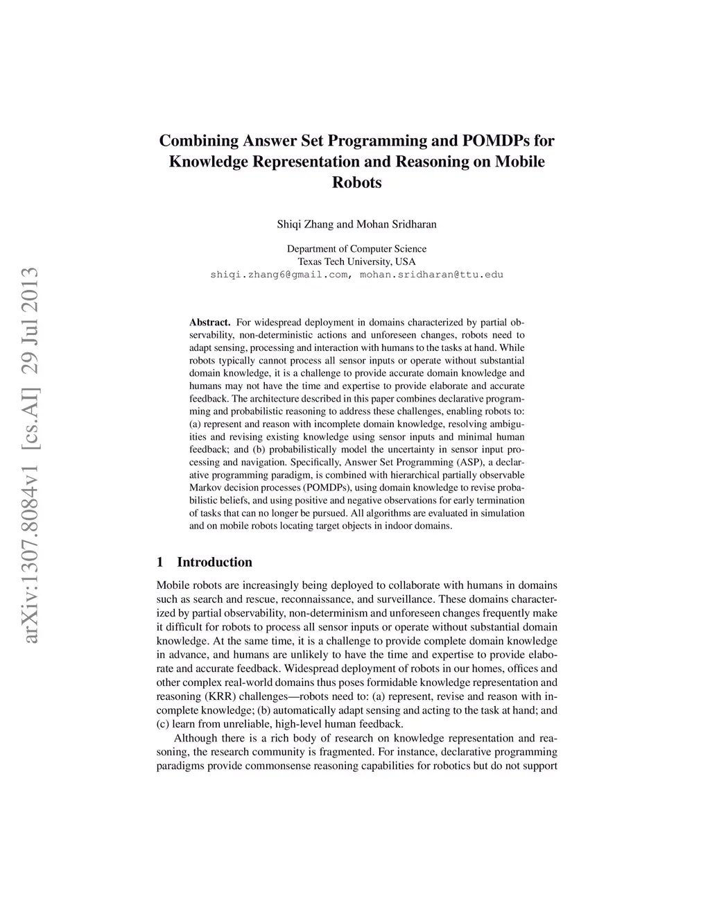 For widespread deployment in domains characterized by partial observability, non-deterministic actions and unforeseen changes, robots need to adapt sensing, processing and interaction with humans to the tasks at hand. While robots typically cannot process all sensor inputs or operate without substantial domain knowledge, it is a challenge to provide accurate domain knowledge and humans may not have the time and expertise to provide elaborate and accurate feedback. The architecture described in this paper combines declarative programming and probabilistic reasoning to address these challenges, enabling robots to: (a) represent and reason with incomplete domain knowledge, resolving ambiguities and revising existing knowledge using sensor inputs and minimal human feedback; and (b) probabilistically model the uncertainty in sensor input processing and navigation. Specifically, Answer Set Programming (ASP), a declarative programming paradigm, is combined with hierarchical partially observable Markov decision processes (POMDPs), using domain knowledge to revise probabilistic beliefs, and using positive and negative observations for early termination of tasks that can no longer be pursued. All algorithms are evaluated in simulation and on mobile robots locating target objects in indoor domains.