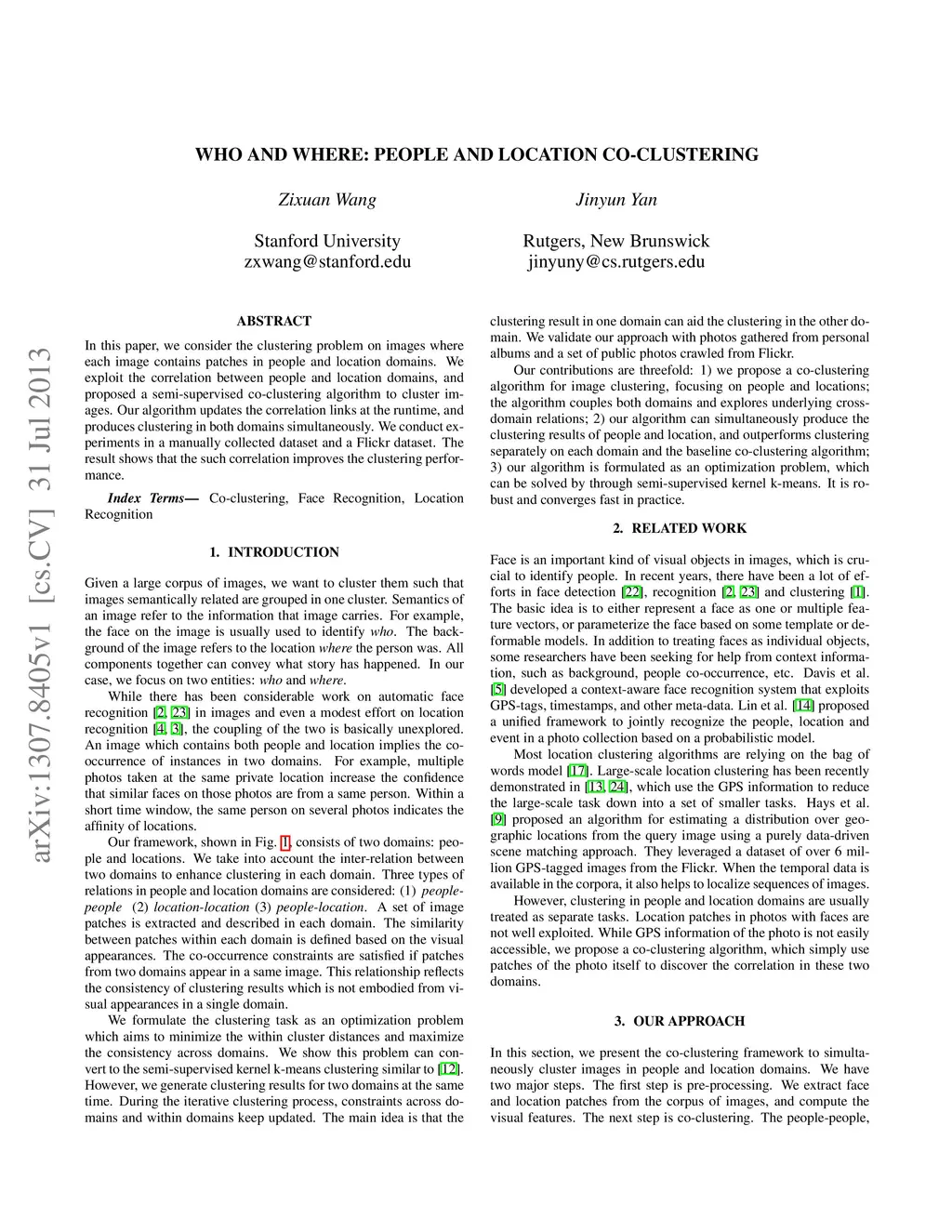 In this paper, we consider the clustering problem on images where each image contains patches in people and location domains. We exploit the correlation between people and location domains, and proposed a semi-supervised co-clustering algorithm to cluster images. Our algorithm updates the correlation links at the runtime, and produces clustering in both domains simultaneously. We conduct experiments in a manually collected dataset and a Flickr dataset. The result shows that the such correlation improves the clustering performance.