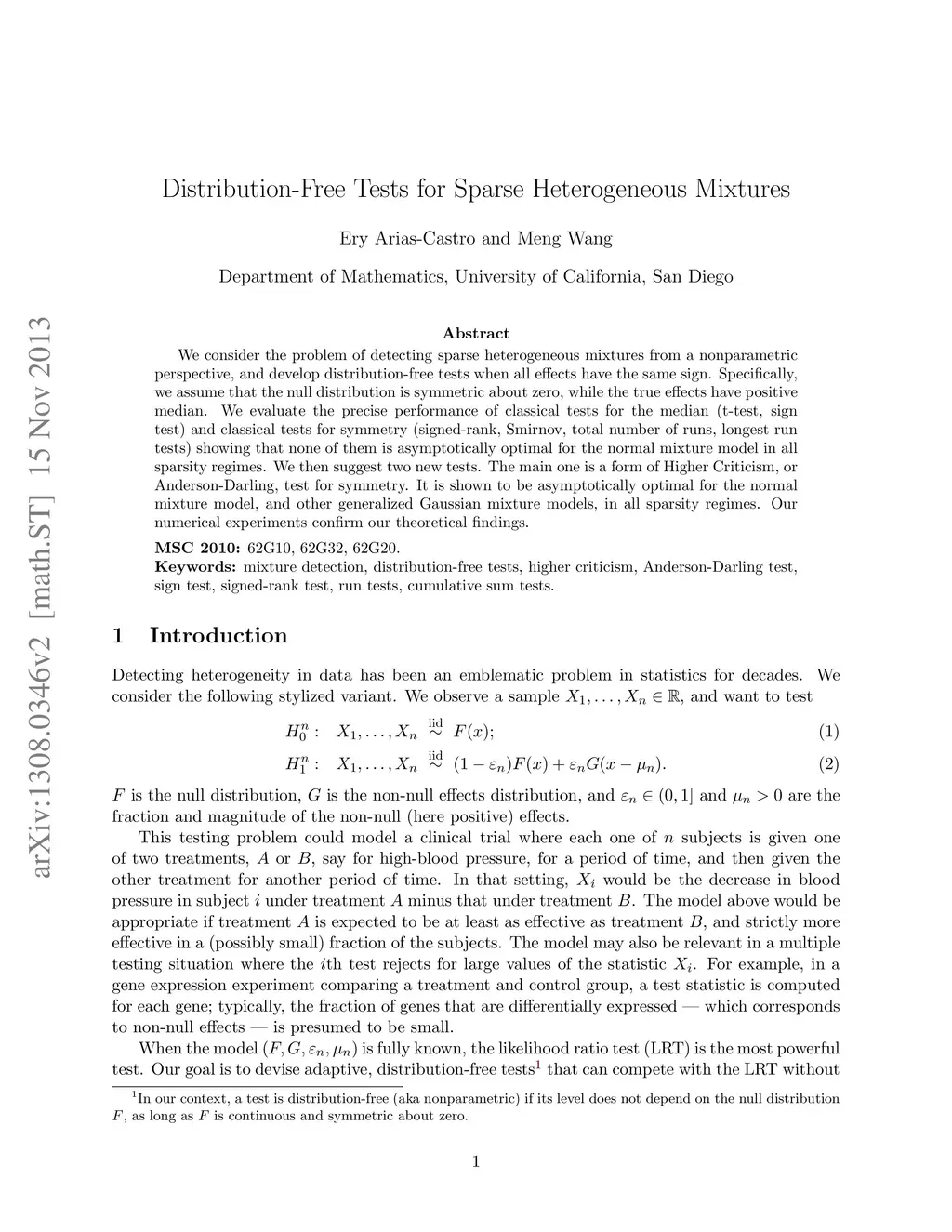 We consider the problem of detecting sparse heterogeneous mixtures from a nonparametric perspective, and develop distribution-free tests when all effects have the same sign. Specifically, we assume that the null distribution is symmetric about zero, while the true effects have positive median. We evaluate the precise performance of classical tests for the median (t-test, sign test) and classical tests for symmetry (signed-rank, Smirnov, total number of runs, longest run tests) showing that none of them is asymptotically optimal for the normal mixture model in all sparsity regimes. We then suggest two new tests. The main one is a form of Higher Criticism, or Anderson-Darling, test for symmetry. It is shown to be asymptotically optimal for the normal mixture model, and other generalized Gaussian mixture models, in all sparsity regimes. Our numerical experiments confirm our theoretical findings.