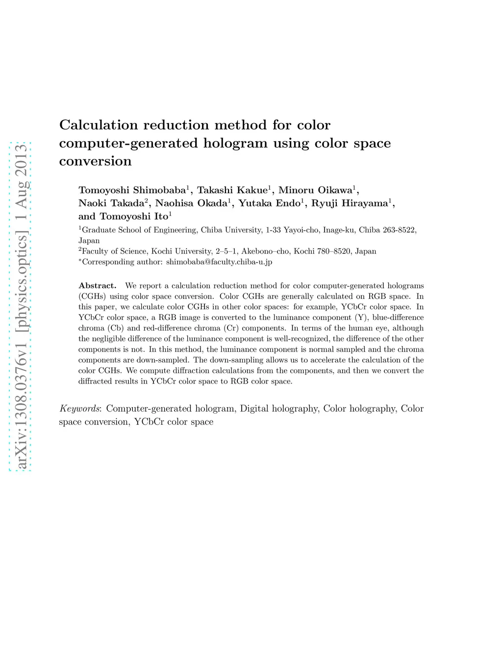 We report a calculation reduction method for color computer-generated holograms (CGHs) using color space conversion. Color CGHs are generally calculated on RGB space. In this paper, we calculate color CGHs in other color spaces: for example, YCbCr color space. In YCbCr color space, a RGB image is converted to the luminance component (Y), blue-difference chroma (Cb) and red-difference chroma (Cr) components. In terms of the human eye, although the negligible difference of the luminance component is well-recognized, the difference of the other components is not. In this method, the luminance component is normal sampled and the chroma components are down-sampled. The down-sampling allows us to accelerate the calculation of the color CGHs. We compute diffraction calculations from the components, and then we convert the diffracted results in YCbCr color space to RGB color space.