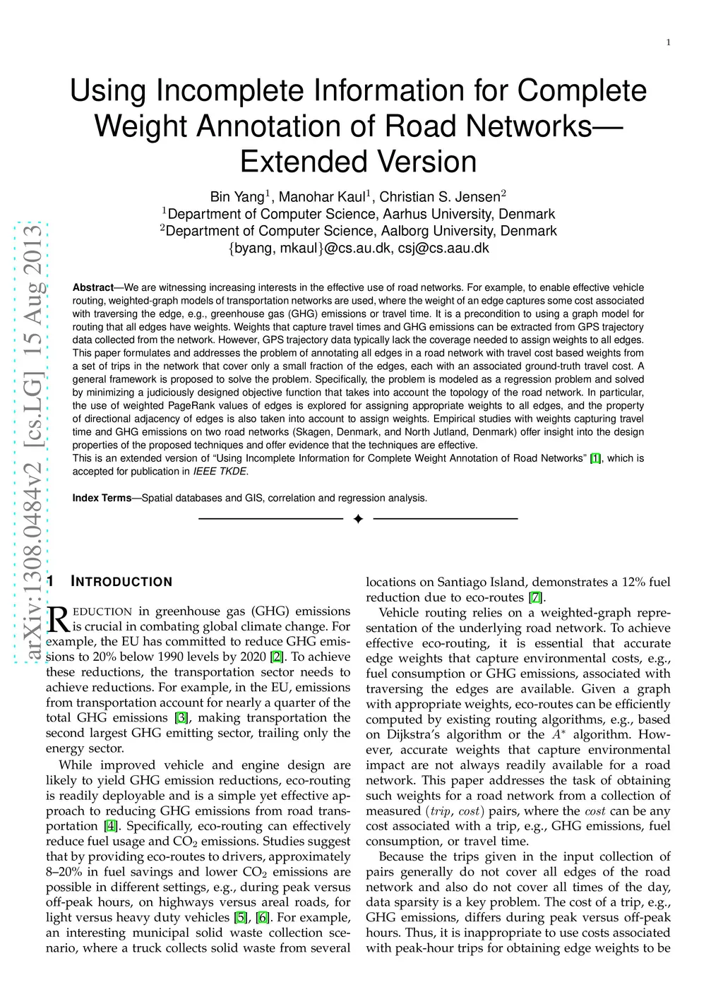 We are witnessing increasing interests in the effective use of road networks. For example, to enable effective vehicle routing, weighted-graph models of transportation networks are used, where the weight of an edge captures some cost associated with traversing the edge, e.g., greenhouse gas (GHG) emissions or travel time. It is a precondition to using a graph model for routing that all edges have weights. Weights that capture travel times and GHG emissions can be extracted from GPS trajectory data collected from the network. However, GPS trajectory data typically lack the coverage needed to assign weights to all edges. This paper formulates and addresses the problem of annotating all edges in a road network with travel cost based weights from a set of trips in the network that cover only a small fraction of the edges, each with an associated ground-truth travel cost. A general framework is proposed to solve the problem. Specifically, the problem is modeled as a regression problem and solved by minimizing a judiciously designed objective function that takes into account the topology of the road network. In particular, the use of weighted PageRank values of edges is explored for assigning appropriate weights to all edges, and the property of directional adjacency of edges is also taken into account to assign weights. Empirical studies with weights capturing travel time and GHG emissions on two road networks (Skagen, Denmark, and North Jutland, Denmark) offer insight into the design properties of the proposed techniques and offer evidence that the techniques are effective.