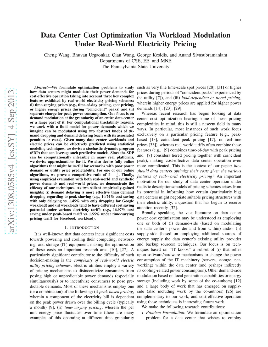 We formulate optimization problems to study how data centers might modulate their power demands for cost-effective operation taking into account three key complex features exhibited by real-world electricity pricing schemes: (i) time-varying prices (e.g., time-of-day pricing, spot pricing, or higher energy prices during coincident peaks) and (ii) separate charge for peak power consumption. Our focus is on demand modulation at the granularity of an entire data center or a large part of it. For computational tractability reasons, we work with a fluid model for power demands which we imagine can be modulated using two abstract knobs of demand dropping and demand delaying (each with its associated penalties or costs). Given many data center workloads and electric prices can be effectively predicted using statistical modeling techniques, we devise a stochastic dynamic program (SDP) that can leverage such predictive models. Since the SDP can be computationally infeasible in many real platforms, we devise approximations for it. We also devise fully online algorithms that might be useful for scenarios with poor power demand or utility price predictability. For one of our online algorithms, we prove a competitive ratio of 2-1/n. Finally, using empirical evaluation with both real-world and synthetic power demands and real-world prices, we demonstrate the efficacy of our techniques. As two salient empirically-gained insights: (i) demand delaying is more effective than demand dropping regarding to peak shaving (e.g., 10.74% cost saving with only delaying vs. 1.45% with only dropping for Google workload) and (ii) workloads tend to have different cost saving potential under various electricity tariffs (e.g., 16.97% cost saving under peak-based tariff vs. 1.55% under time-varying pricing tariff for Facebook workload).