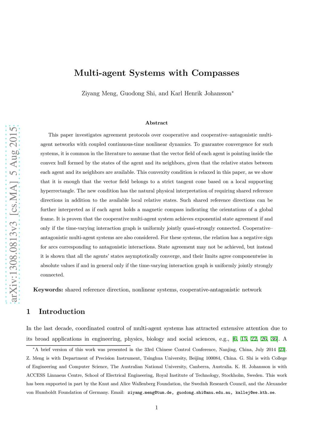 This paper investigates agreement protocols over cooperative and cooperative--antagonistic multi-agent networks with coupled continuous-time nonlinear dynamics. To guarantee convergence for such systems, it is common in the literature to assume that the vector field of each agent is pointing inside the convex hull formed by the states of the agent and its neighbors, given that the relative states between each agent and its neighbors are available. This convexity condition is relaxed in this paper, as we show that it is enough that the vector field belongs to a strict tangent cone based on a local supporting hyperrectangle. The new condition has the natural physical interpretation of requiring shared reference directions in addition to the available local relative states. Such shared reference directions can be further interpreted as if each agent holds a magnetic compass indicating the orientations of a global frame. It is proven that the cooperative multi-agent system achieves exponential state agreement if and only if the time-varying interaction graph is uniformly jointly quasi-strongly connected. Cooperative--antagonistic multi-agent systems are also considered. For these systems, the relation has a negative sign for arcs corresponding to antagonistic interactions. State agreement may not be achieved, but instead it is shown that all the agents' states asymptotically converge, and their limits agree componentwise in absolute values if and in general only if the time-varying interaction graph is uniformly jointly strongly connected.